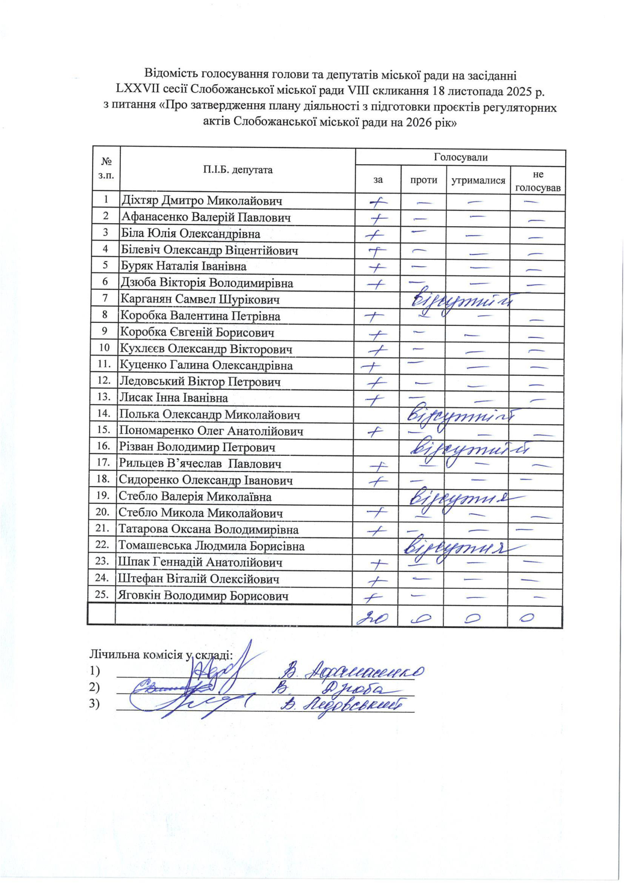 Відомості голосування до рішення сесії №3301 Про затвердження плану діяльності з підготовки проєктів регуляторних актів Слобожанської міської ради на 2026 рік