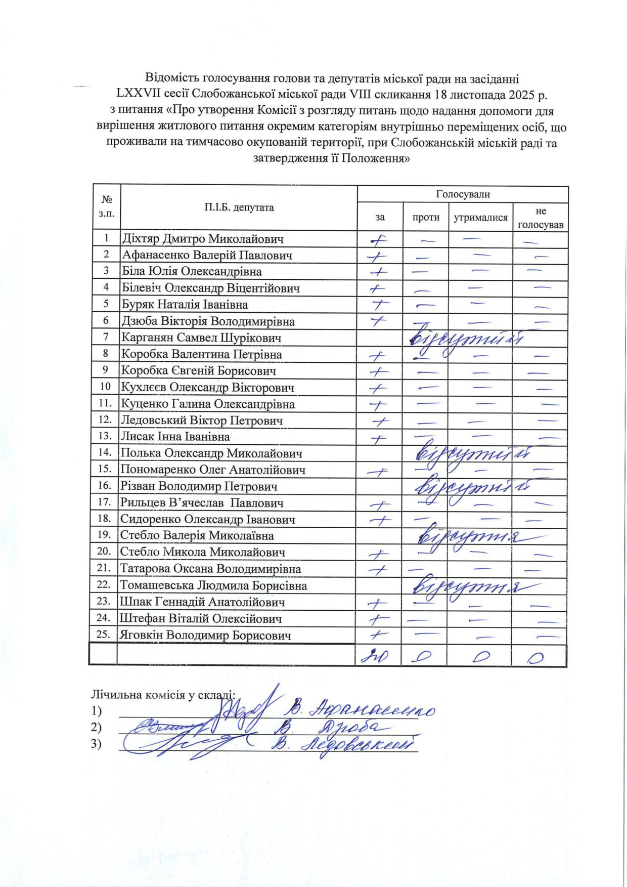 Відомості голосування до рішення сесії №3305 Про утворення Комісії з розгляду питань щодо надання допомоги для вирішення житлового питання окремим категоріям внутрішньо переміщених осіб, що проживали на тимчасово окупованій території, при Слобожанській міській раді та затвердження її Положення
