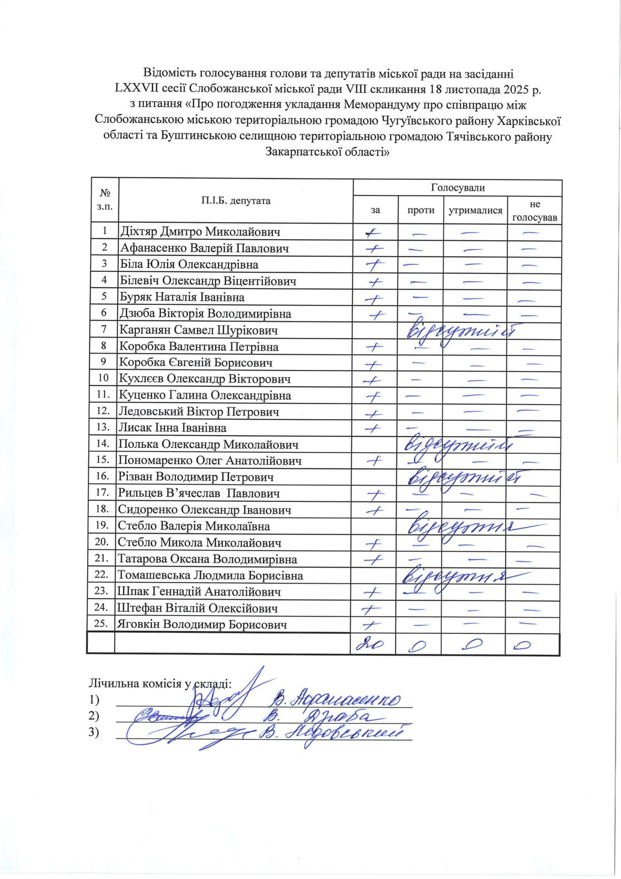 Відомості голосування до рішення сесії №3306 Про погодження укладання Меморандуму про співпрацю між Слобожанською міською територіальною громадою Чугуївського району Харківської області та Буштинською селищною територіальною громадою Тячівського району Закарпатської області