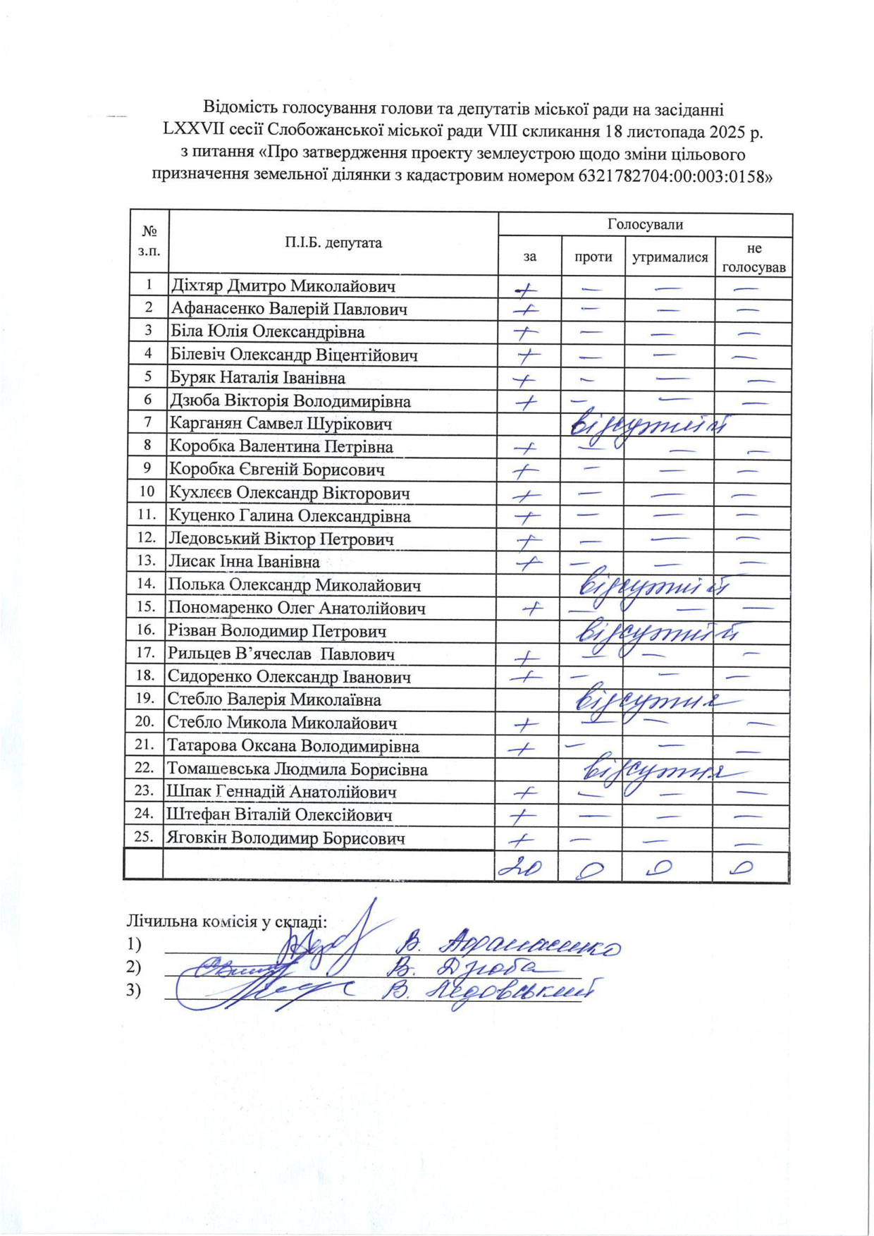 Відомості голосування до рішення сесії №3312 Про затвердження проекту землеустрою щодо зміни цільового призначення земельної ділянки з кадастровим номером 6321782704:00:003:0158