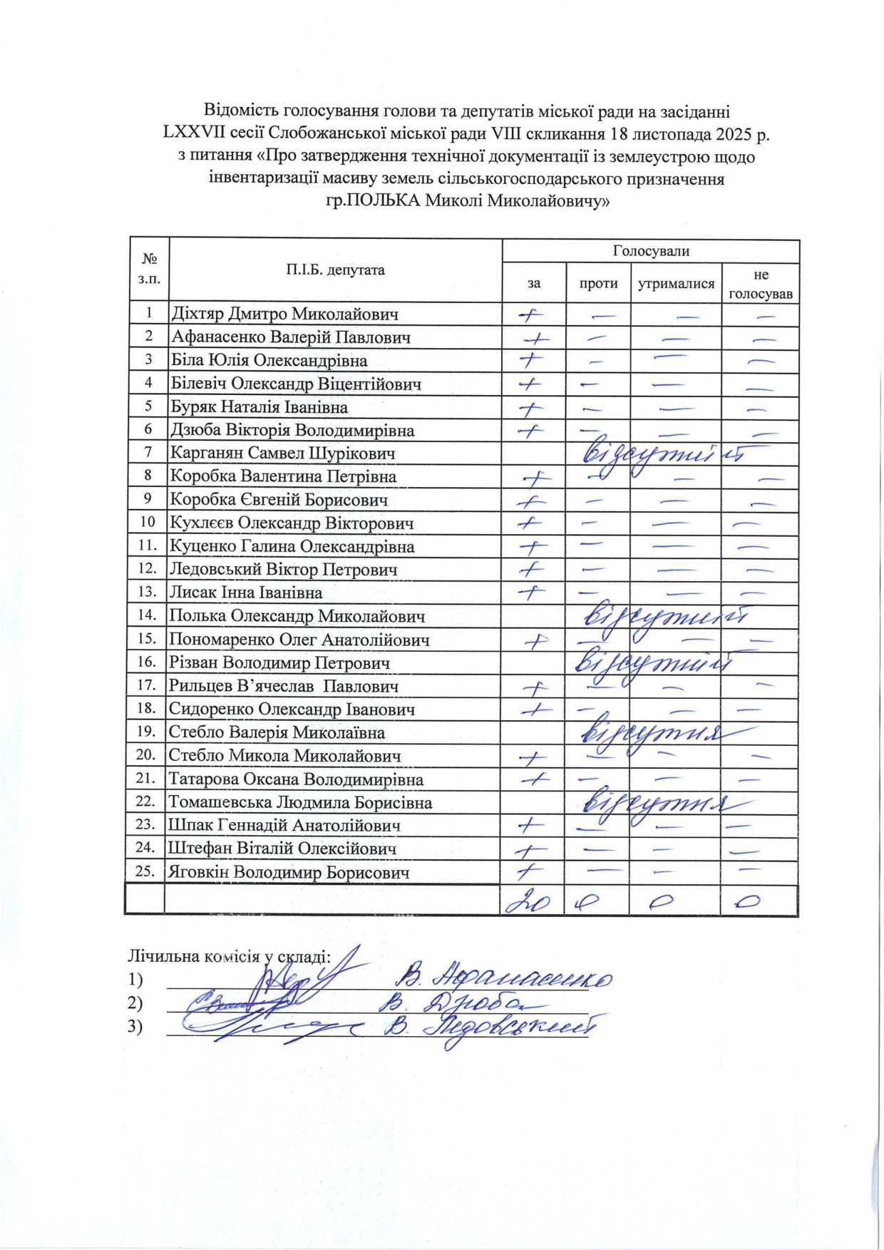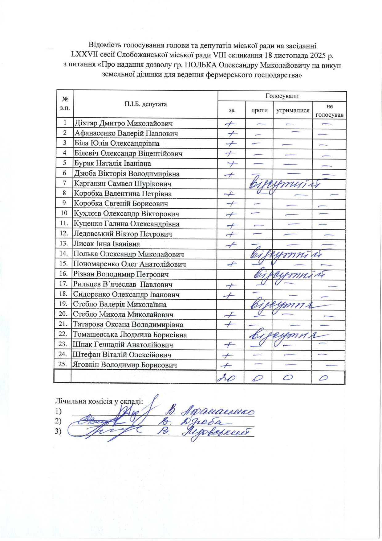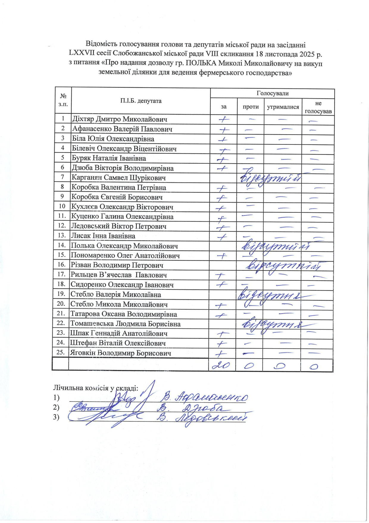 Відомості голосування до рішення сесії №3321 Про надання дозволу гр. ПОЛЬКА Миколі Миколайовичу на викуп земельної ділянки для ведення фермерського господарства