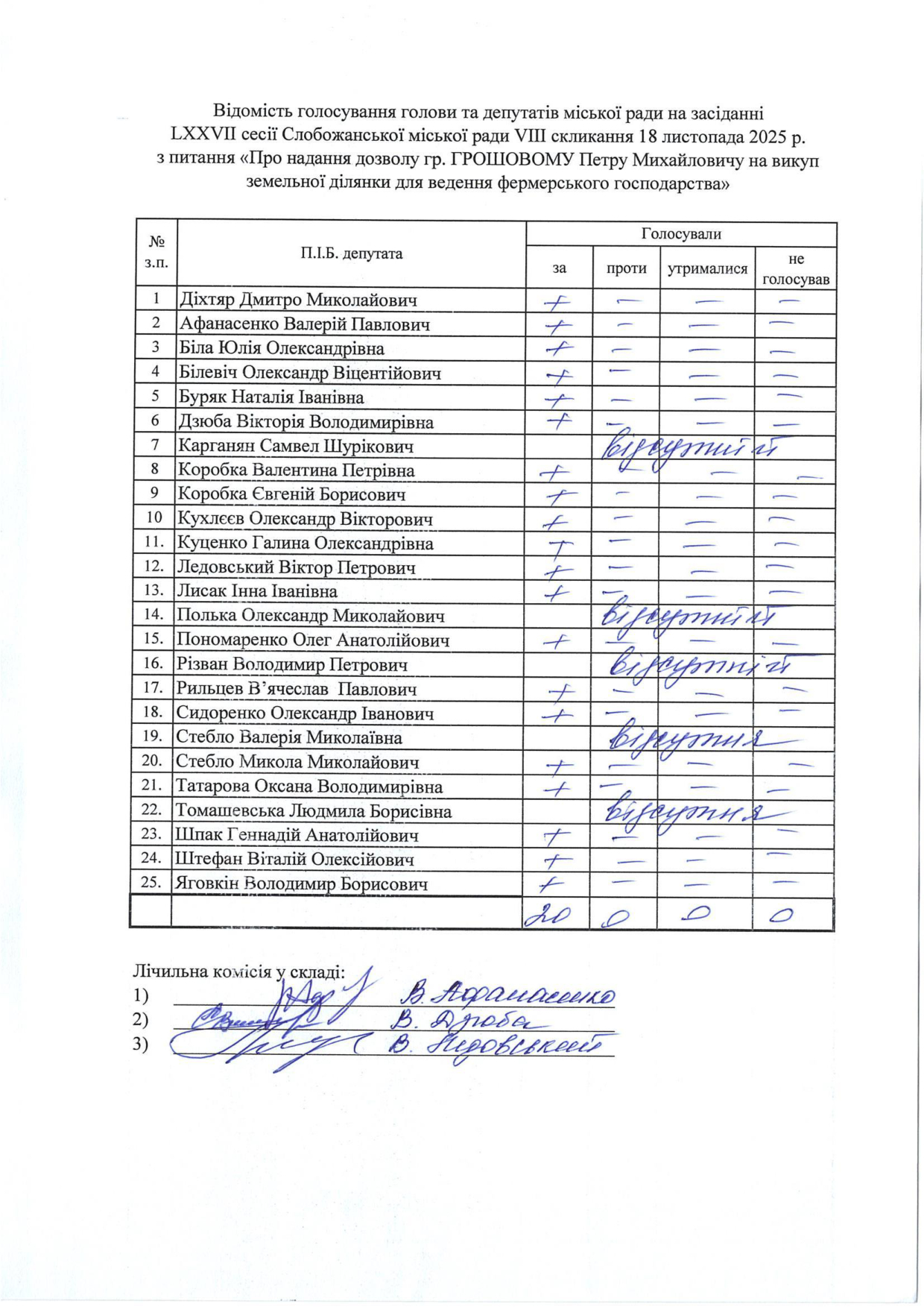 Відомості голосування до рішення сесії №3320 Про надання дозволу гр. ГРОШОВОМУ Петру Михайловичу на викуп земельної ділянки для ведення фермерського господарства