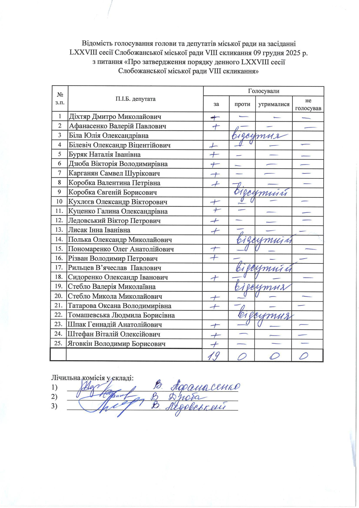 Відомості голосування до рішення сесії №3325 Про затвердження порядку денного LXXVIІІ сесії Слобожанської міської ради VІІІ скликання