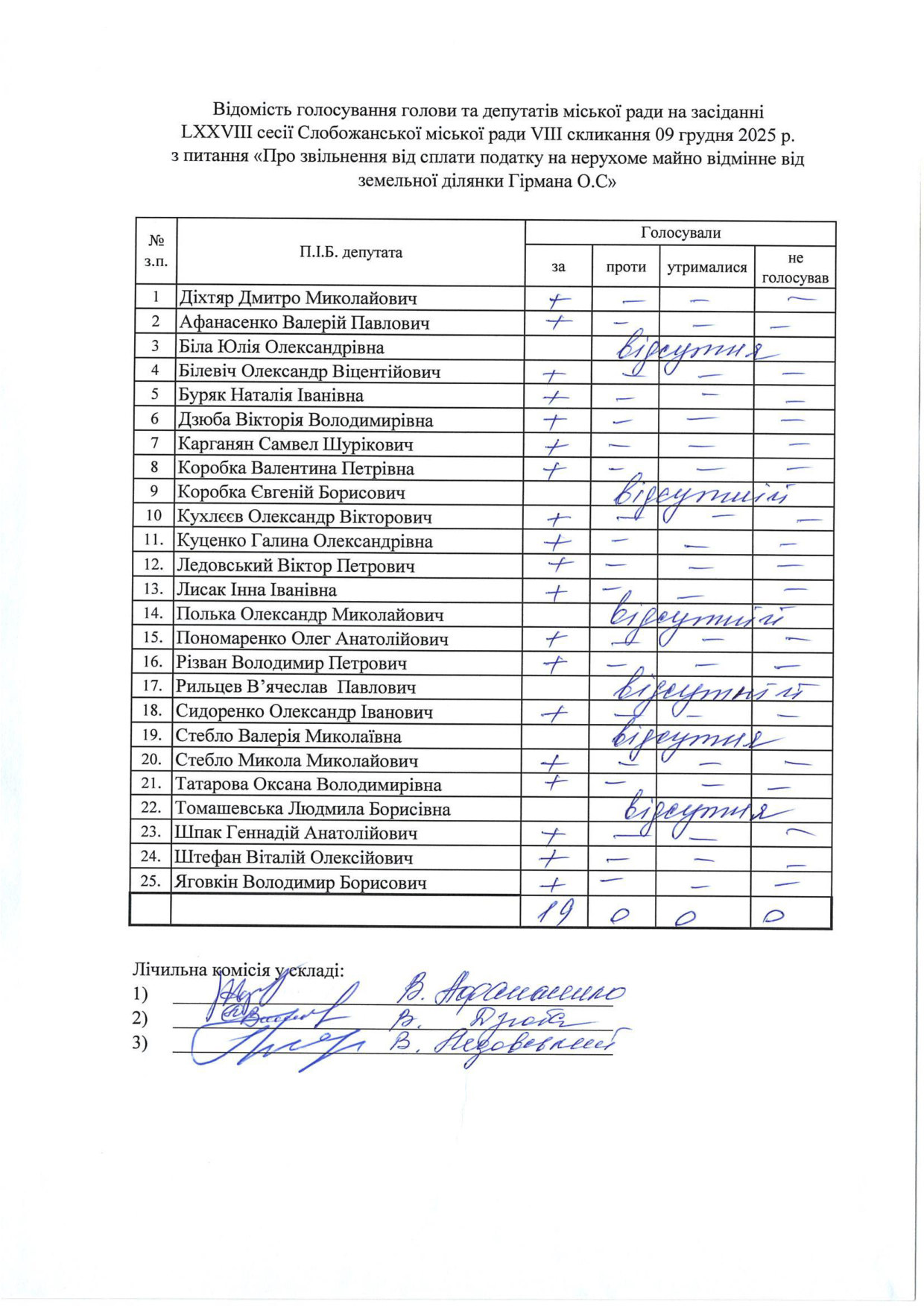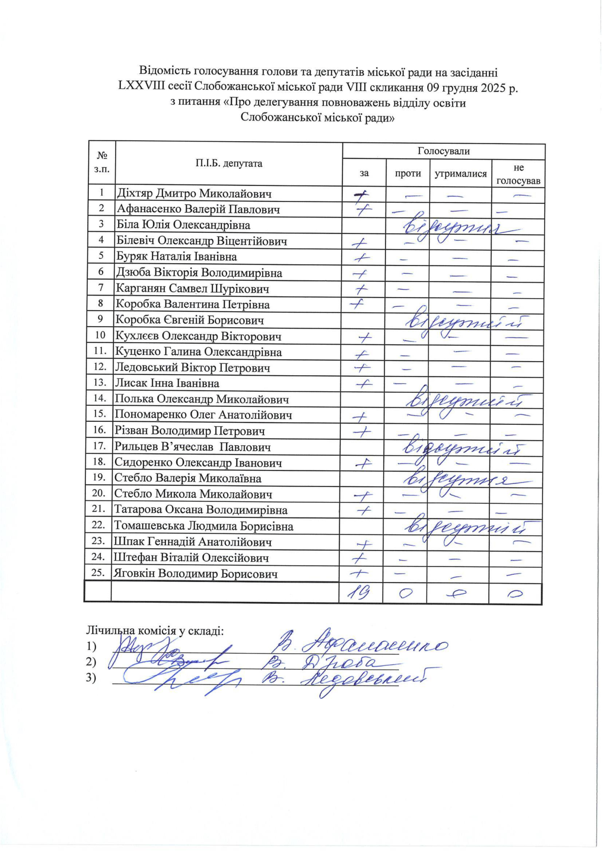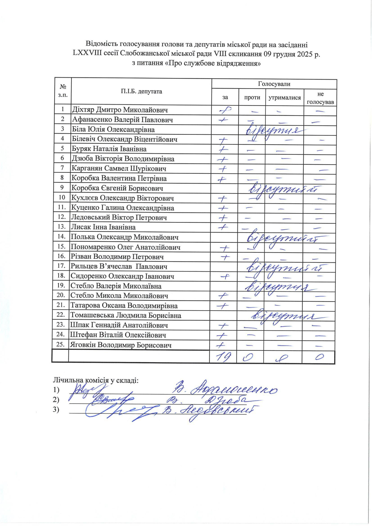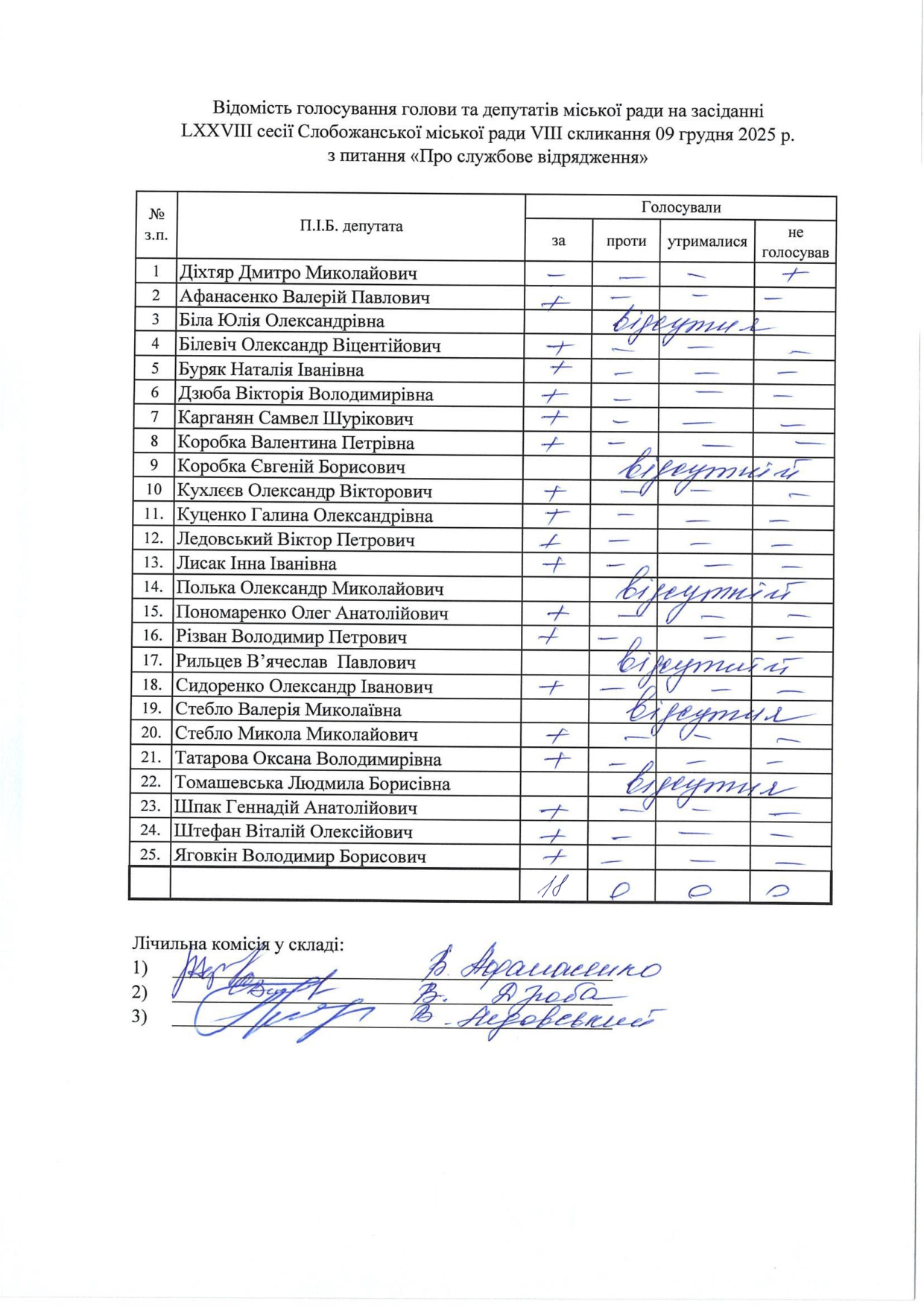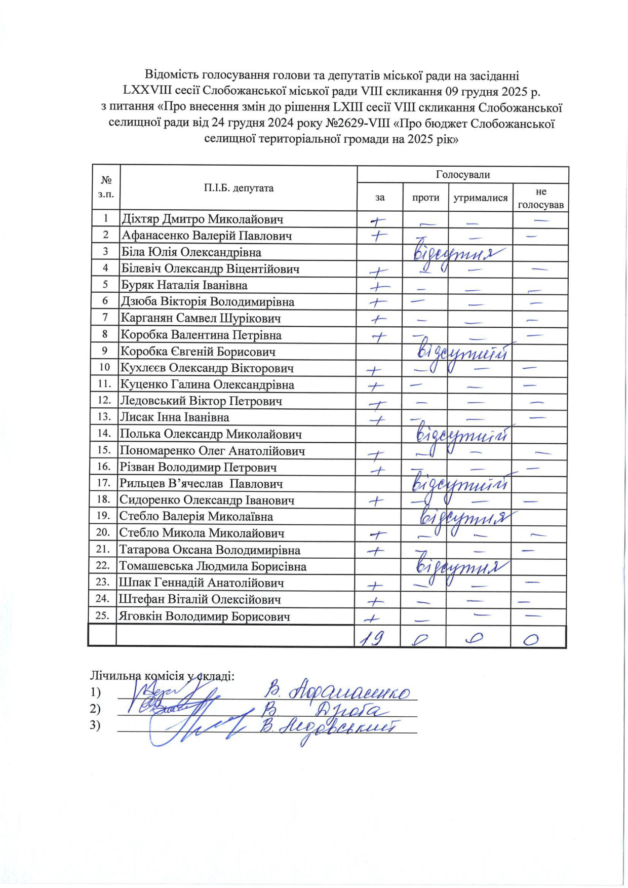 Відомості голосування до рішення сесії №3326 Про внесення змін до рішення LXIII сесії VIII скликання Слобожанської селищної ради від 24 грудня 2024 року №2629-VIII «Про бюджет Слобожанської селищної територіальної громади на 2025 рік»