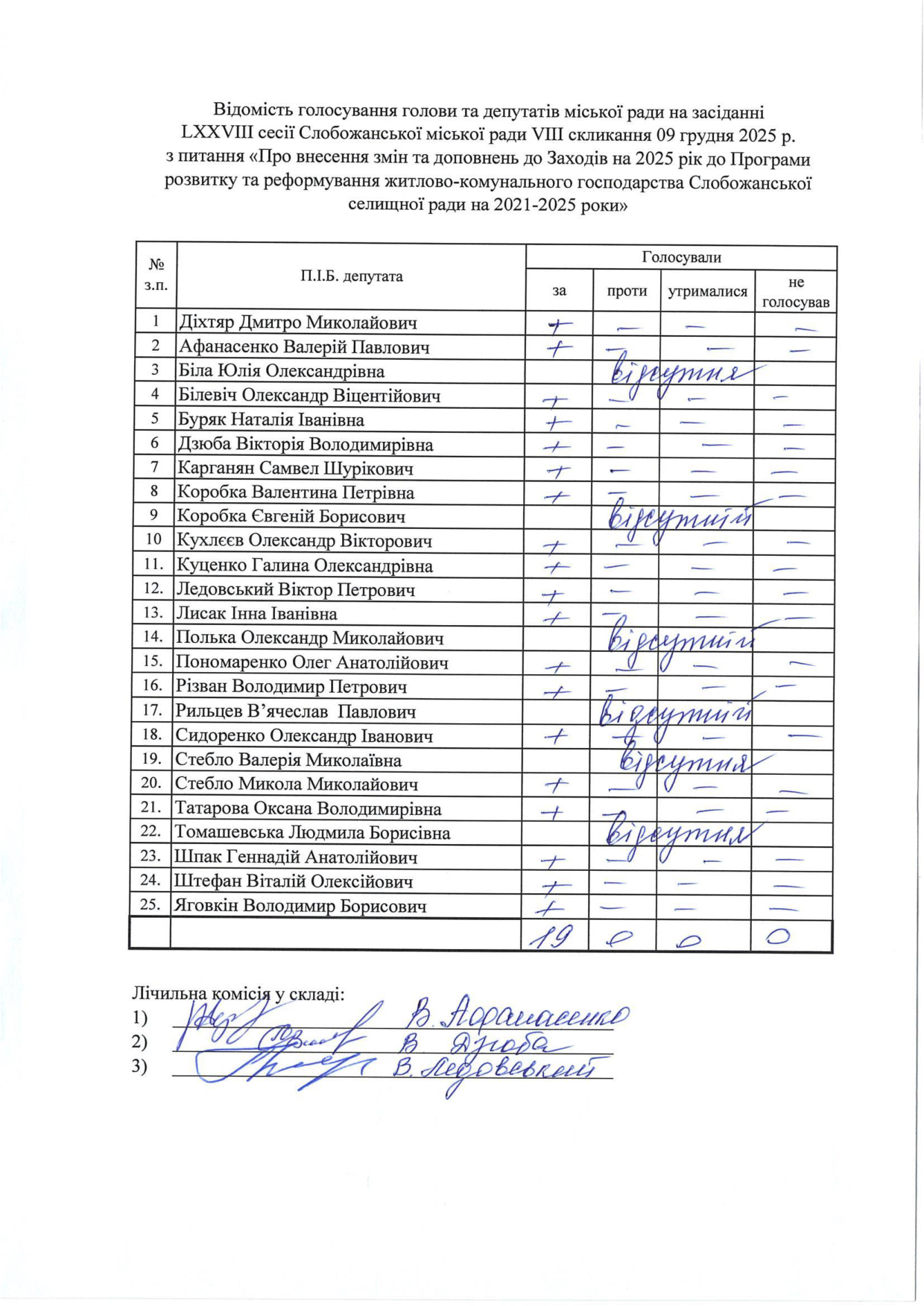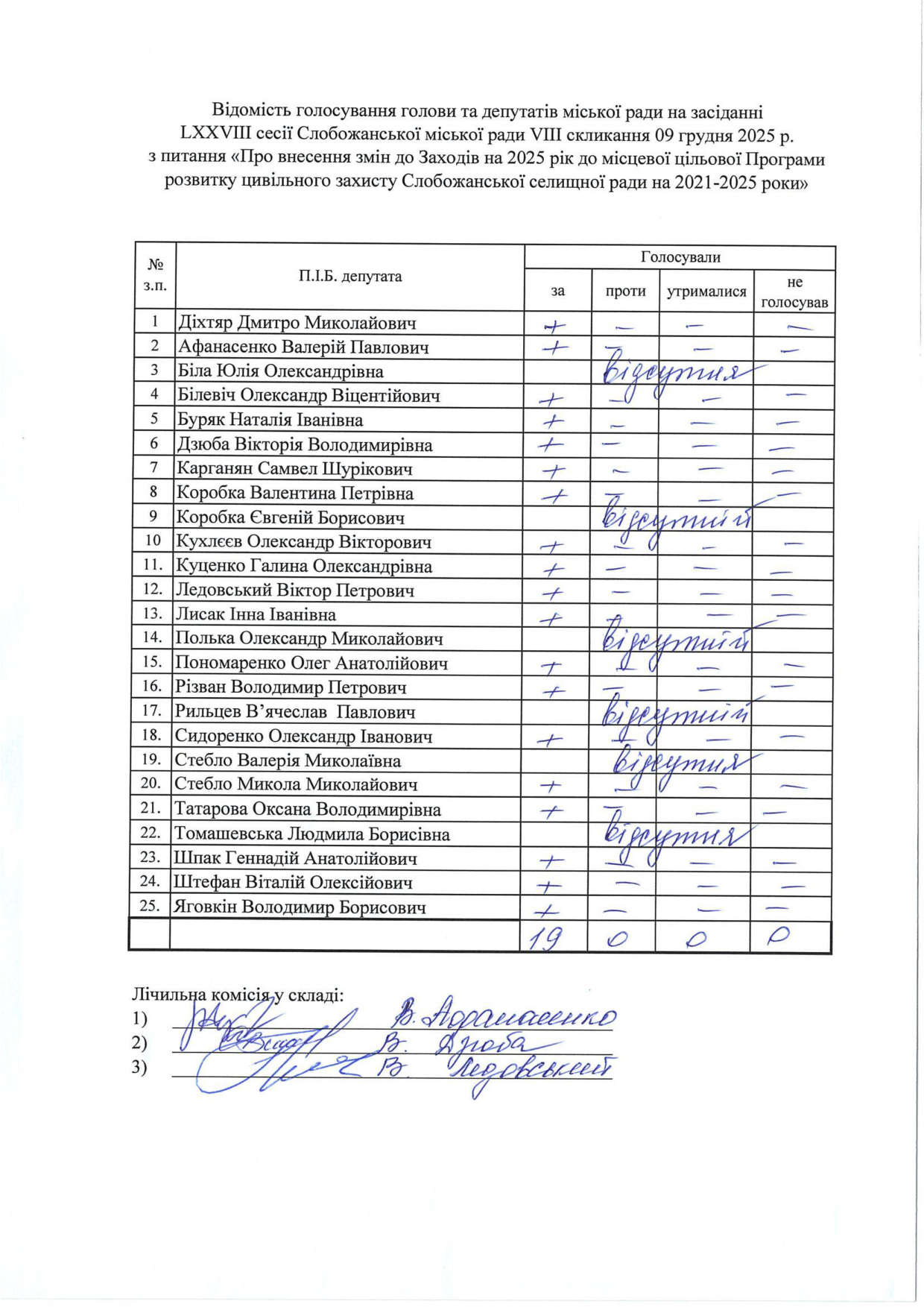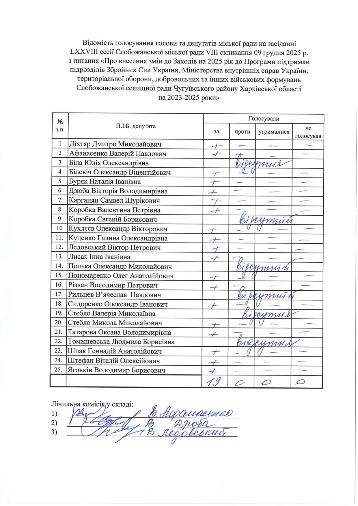 Відомості голосування до рішення сесії №3328 Про внесення змін до Заходів на 2025 рік до Програми підтримки підрозділів Збройних Сил України, Міністерства внутрішніх справ України, територіальної оборони, добровольчих та інших військових формувань Слобожанської селищної ради Чугуївського району Харківської області на 2023-2025 роки