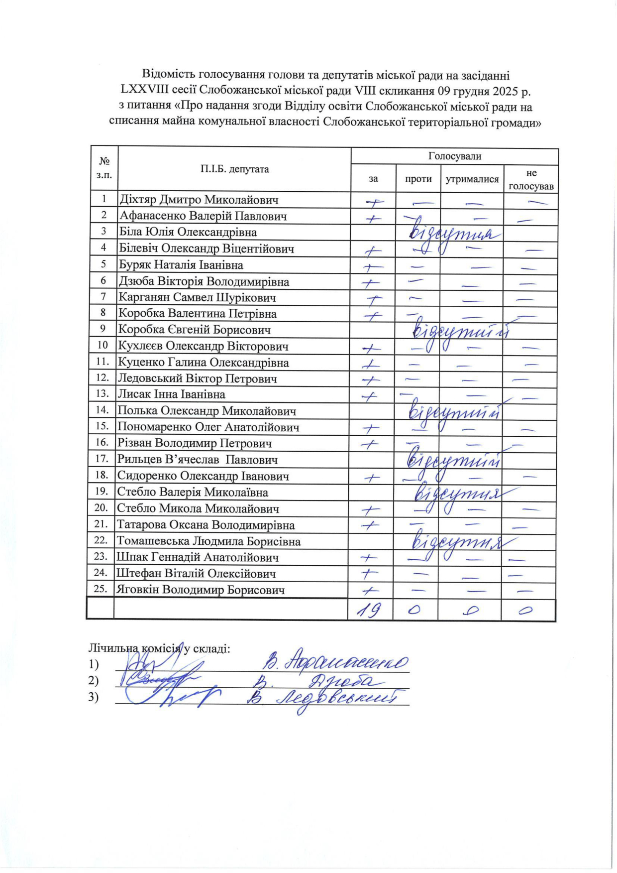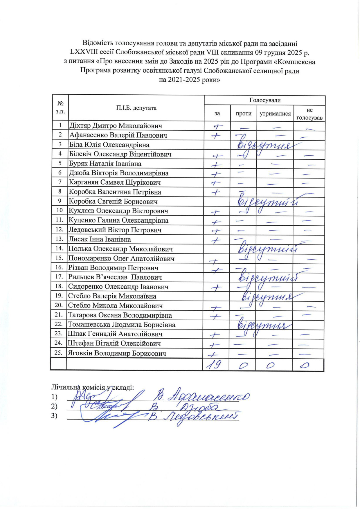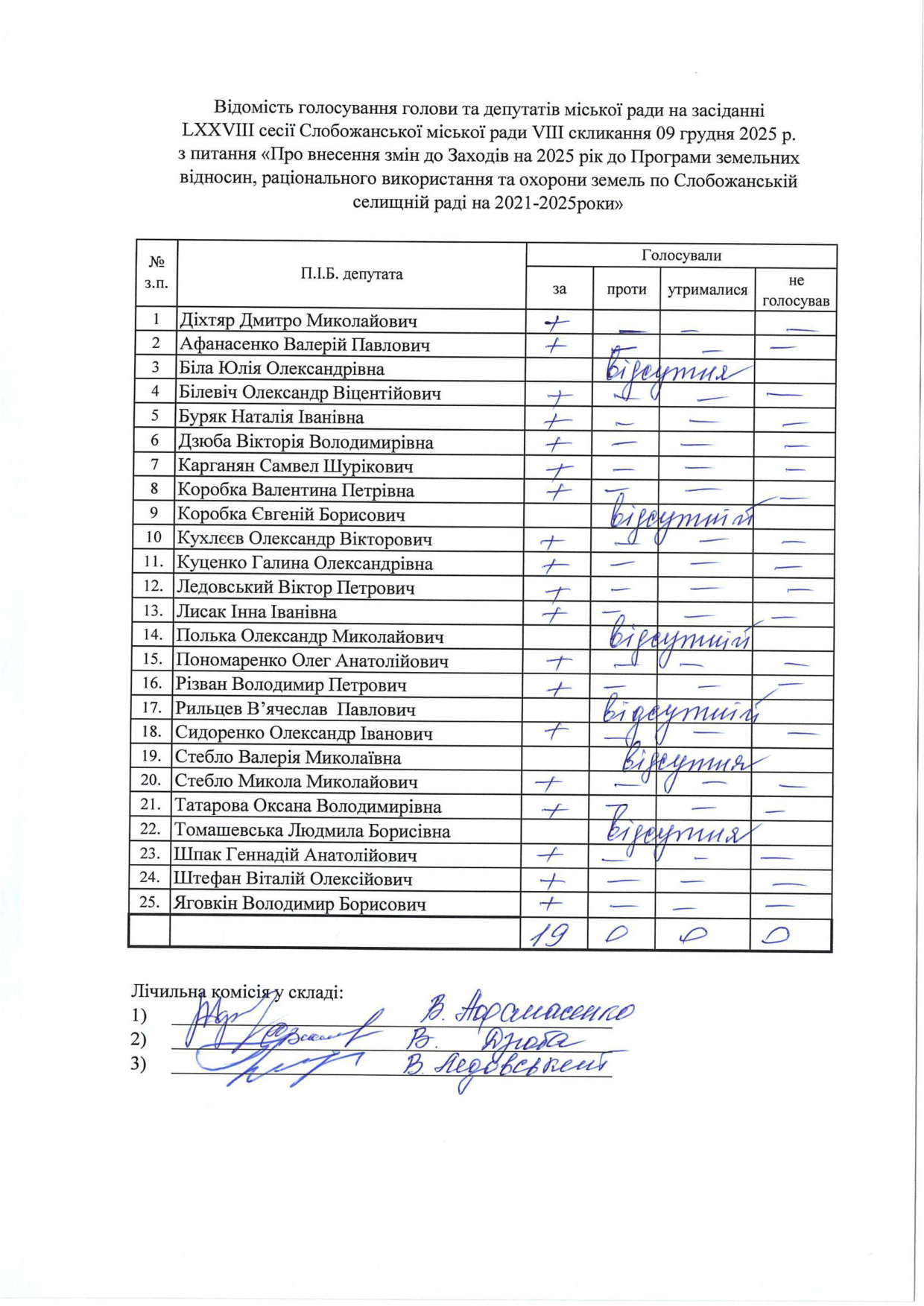 Відомості голосування до рішення сесії №3328 Про внесення змін до Заходів на 2025 рік до Програми підтримки підрозділів Збройних Сил України, Міністерства внутрішніх справ України, територіальної оборони, добровольчих та інших військових формувань Слобожанської селищної ради Чугуївського району Харківської області на 2023-2025 роки