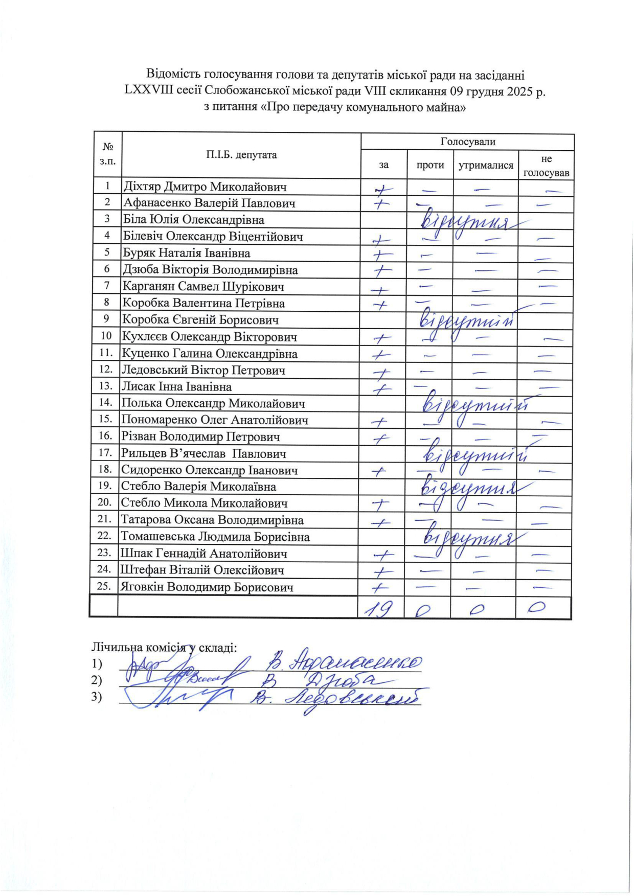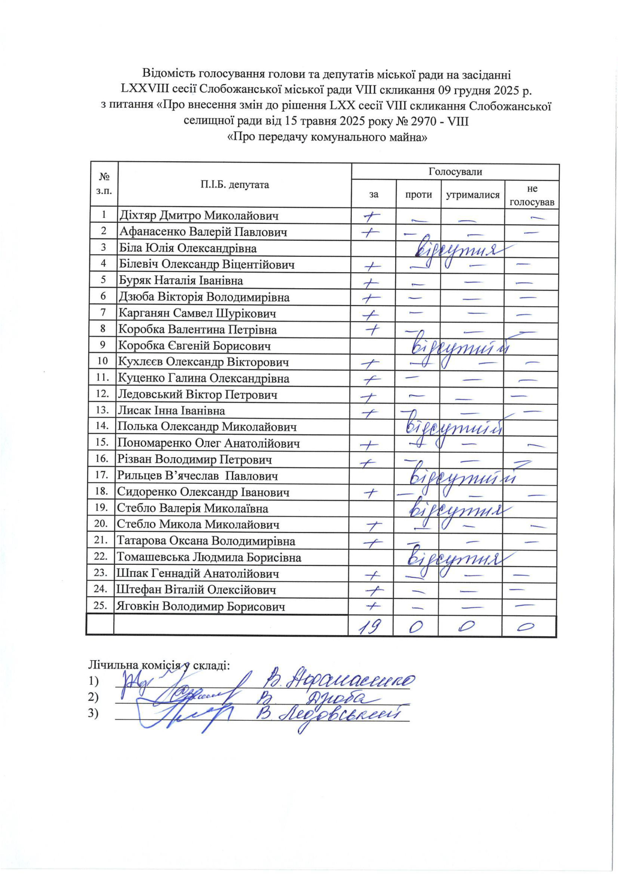 Відомості голосування до рішення сесії №3333 Про внесення змін до рішення LХX сесії VIІI скликання Слобожанської селищної ради від 15 травня 2025 року № 2970 - VIІI «Про передачу комунального майна»