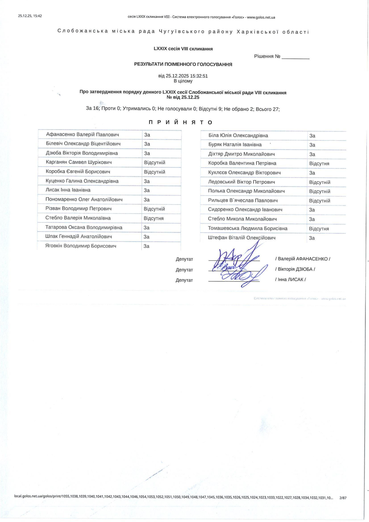 Відомості голосування до рішення сесії №3339 Про затвердження порядку денного LXXІX сесії Слобожанської міської ради VІІІ скликання