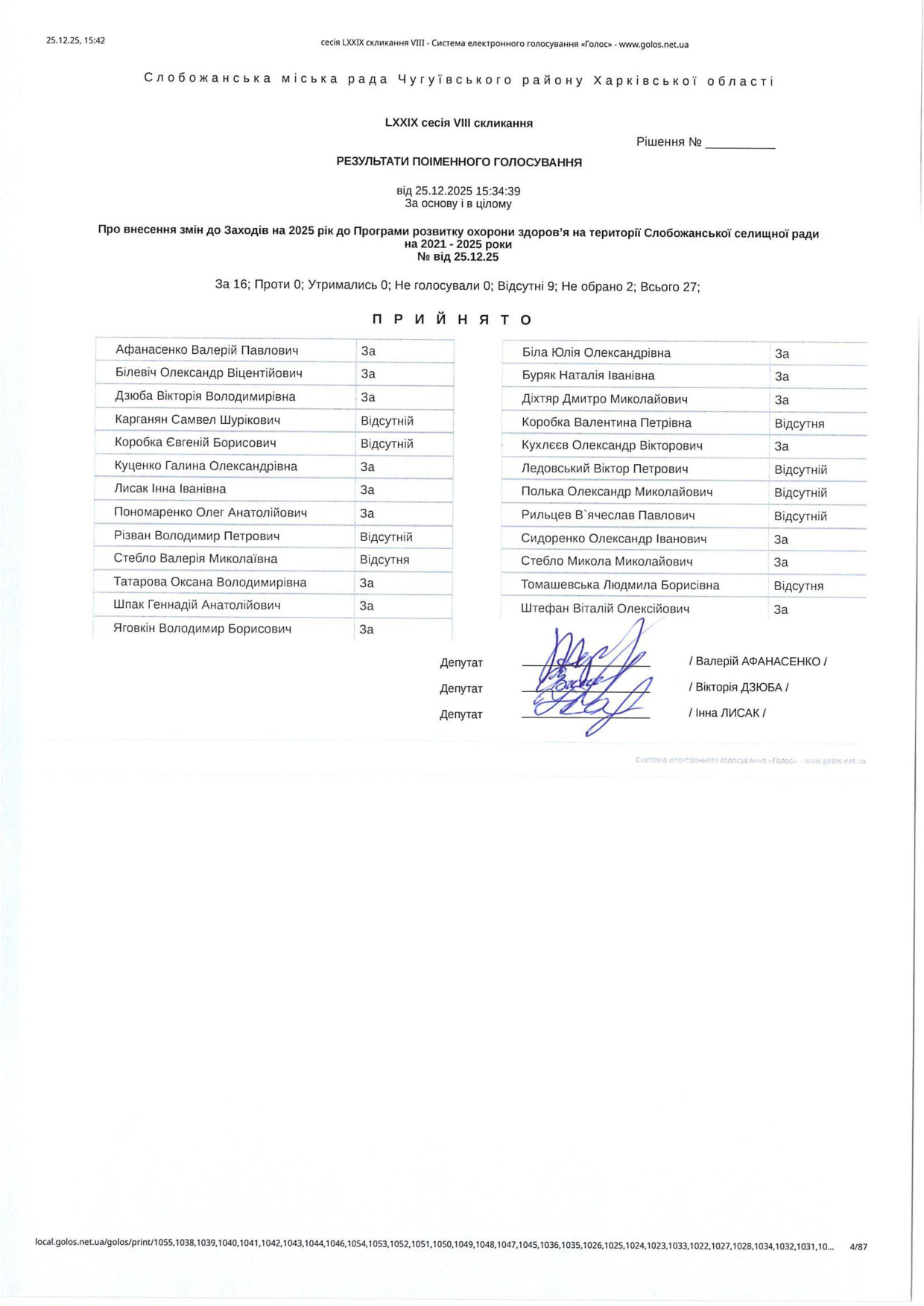 Відомості голосування до рішення сесії №3360 Про затвердження Заходів на 2026 рік до Програми розвитку та підтримки комунальних закладів охорони здоров’я Слобожанської міської ради на 2026 – 2030 роки