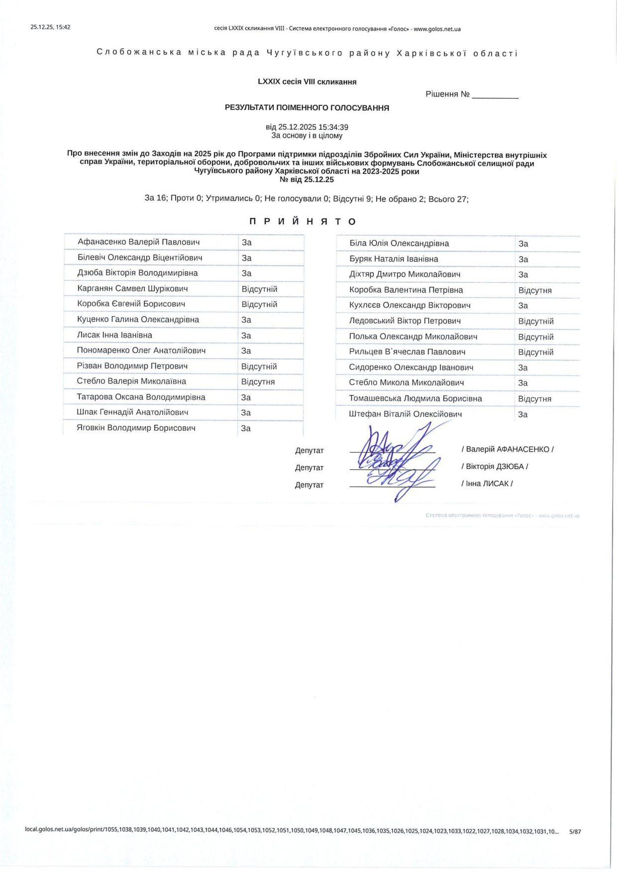 Відомості голосування до рішення сесії №3342 Про внесення змін до Заходів на 2025 рік до Програми підтримки підрозділів Збройних Сил України, Міністерства внутрішніх справ України, територіальної оборони, добровольчих та інших військових формувань Слобожанської селищної ради Чугуївського району Харківської області на 2023-2025 роки