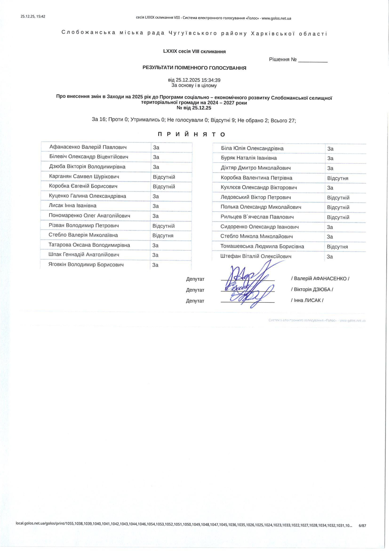 Відомості голосування до рішення сесії №3354 Про затвердження Заходів на 2026 рік до Програми соціального захисту населення Слобожанської міської територіальної громади Чугуївського району Харківської області на 2026 - 2030 роки