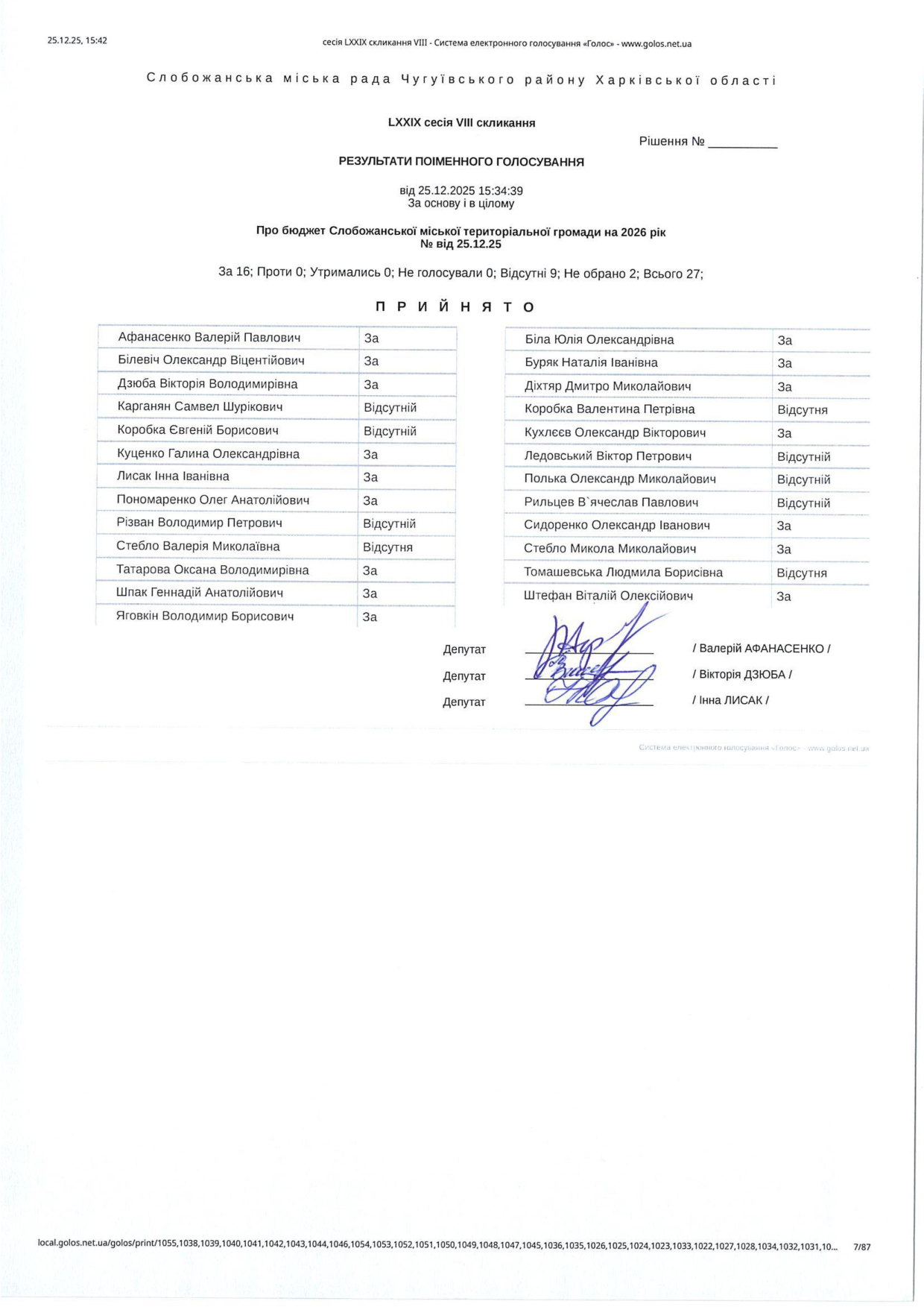 Відомості голосування до рішення сесії №3344 Про бюджет Слобожанської міської територіальної громади на 2026 рік