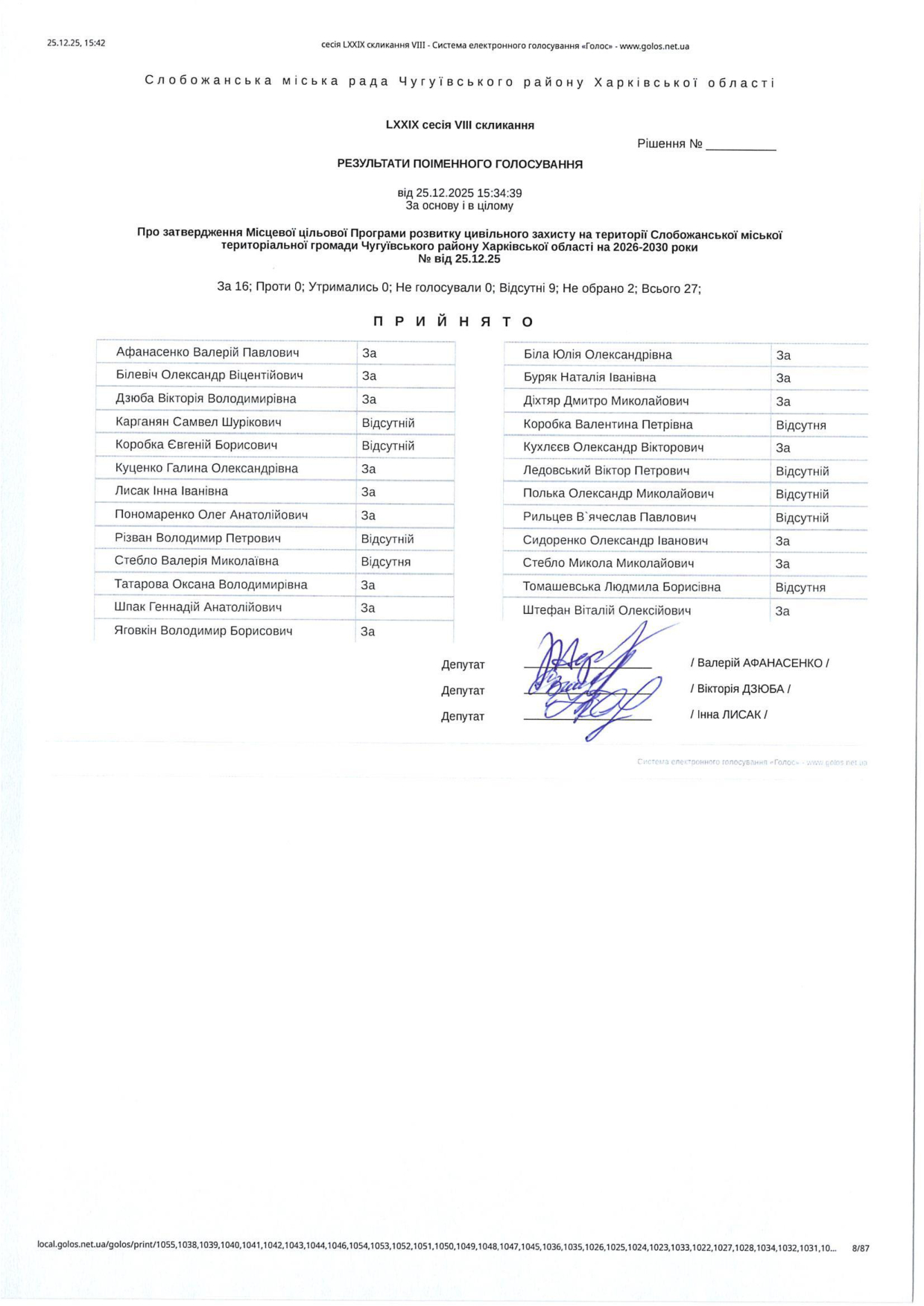 Відомості голосування до рішення сесії №3345 Про затвердження Місцевої цільової Програми розвитку цивільного захисту на території Слобожанської міської територіальної громади Чугуївського району Харківської області на 2026-2030 роки