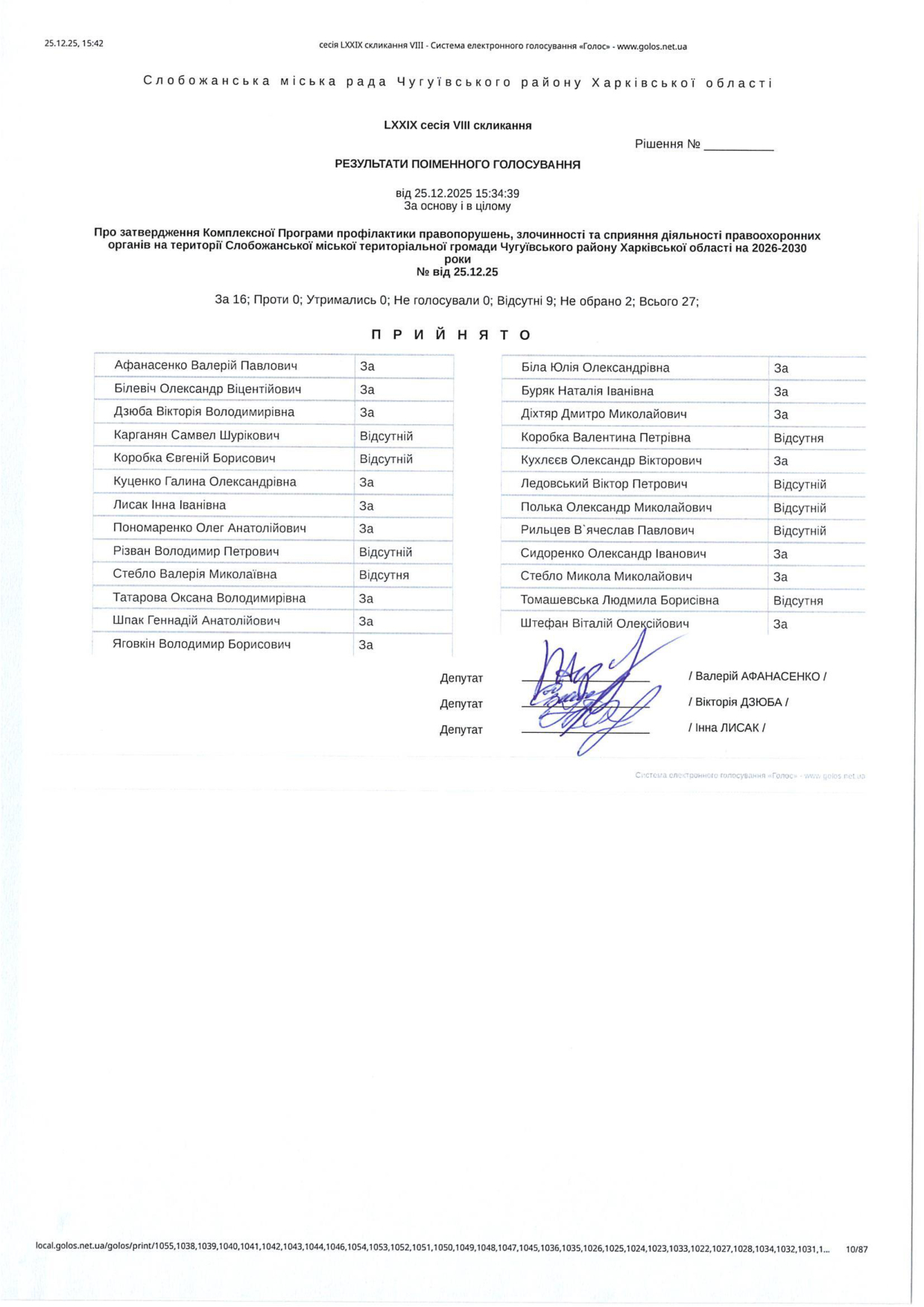 Відомості голосування до рішення сесії №3347 Про затвердження Комплексної Програми профілактики правопорушень, злочинності та сприяння діяльності правоохоронних органів на території Слобожанської міської територіальної громади Чугуївського району Харківської області на 2026-2030 роки