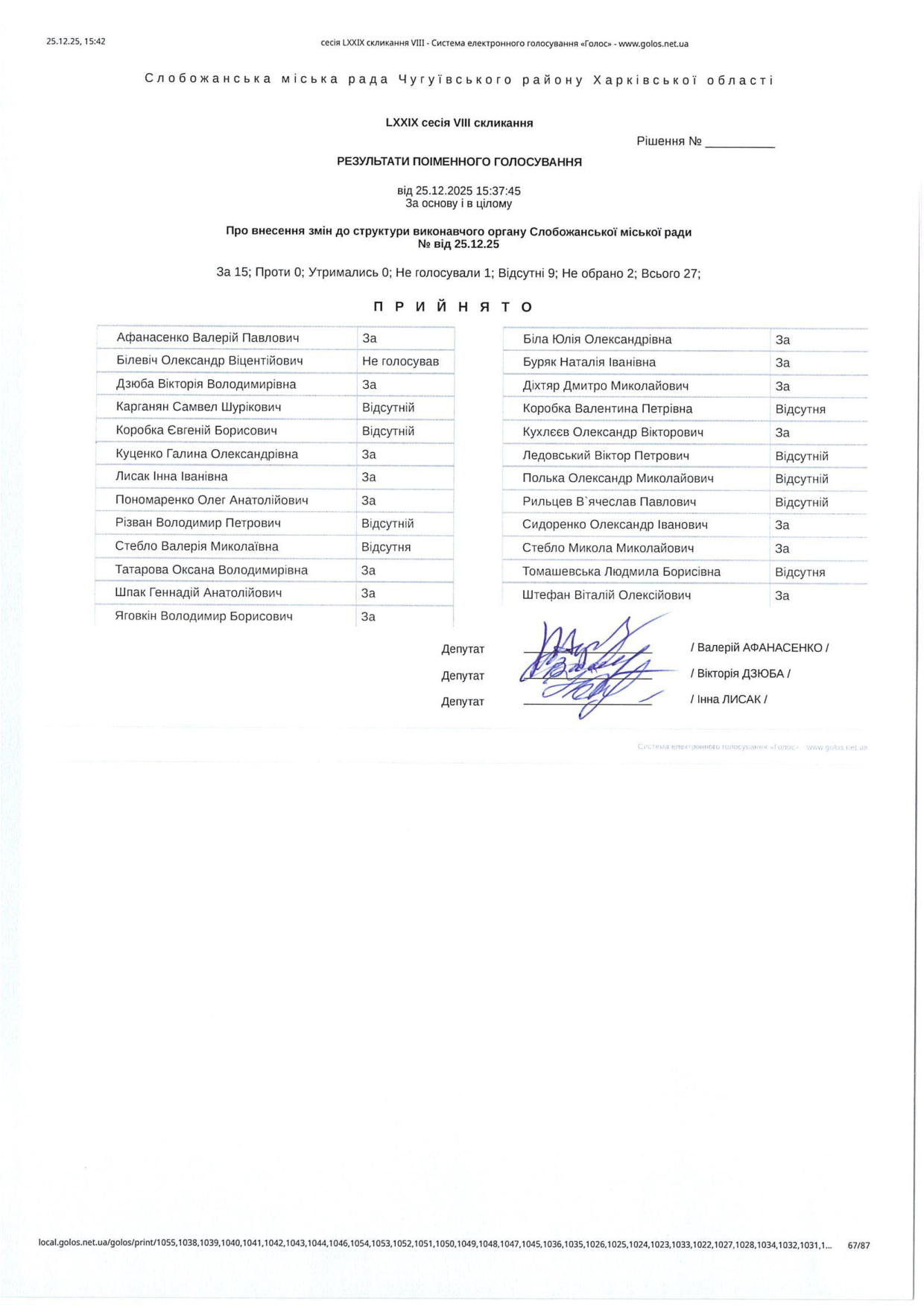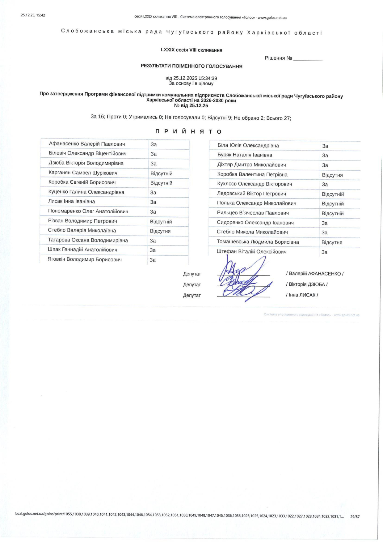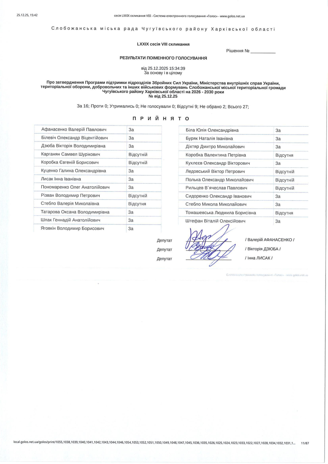 Відомості голосування до рішення сесії №3352 Про затвердження Заходів на 2026 рік до Програми підтримки Захисників і Захисниць України та членів їх сімей Слобожанської міської територіальної громади Чугуївського району Харківської області на 2026- 2030 роки
