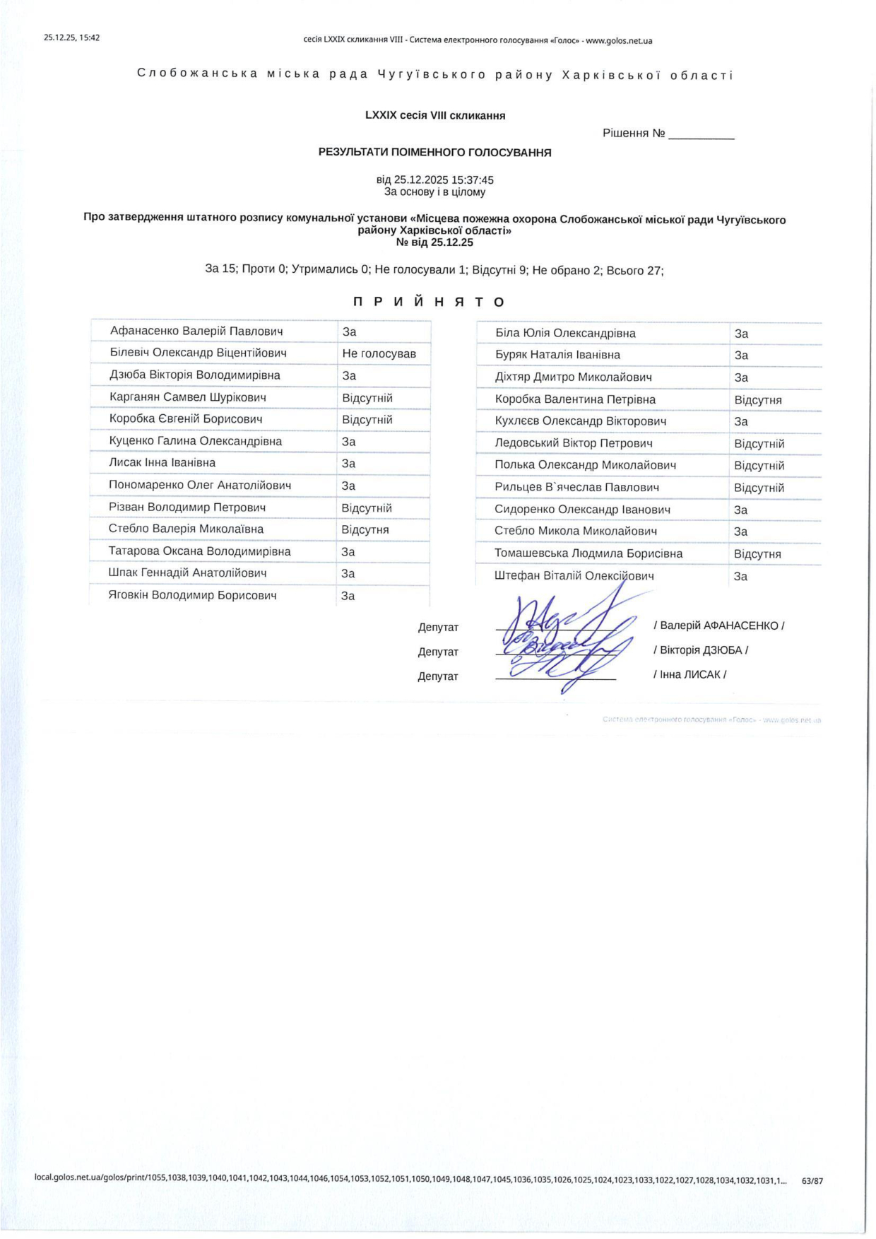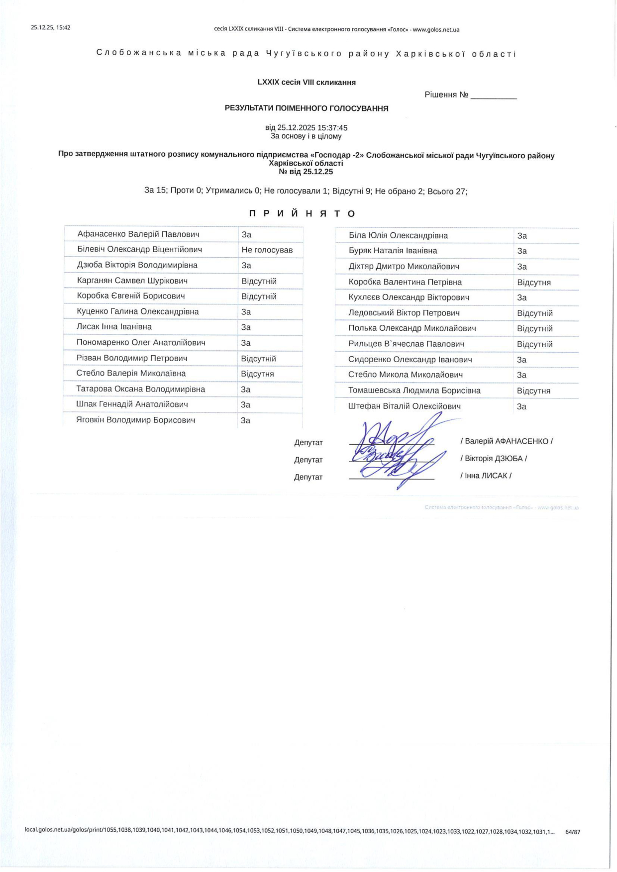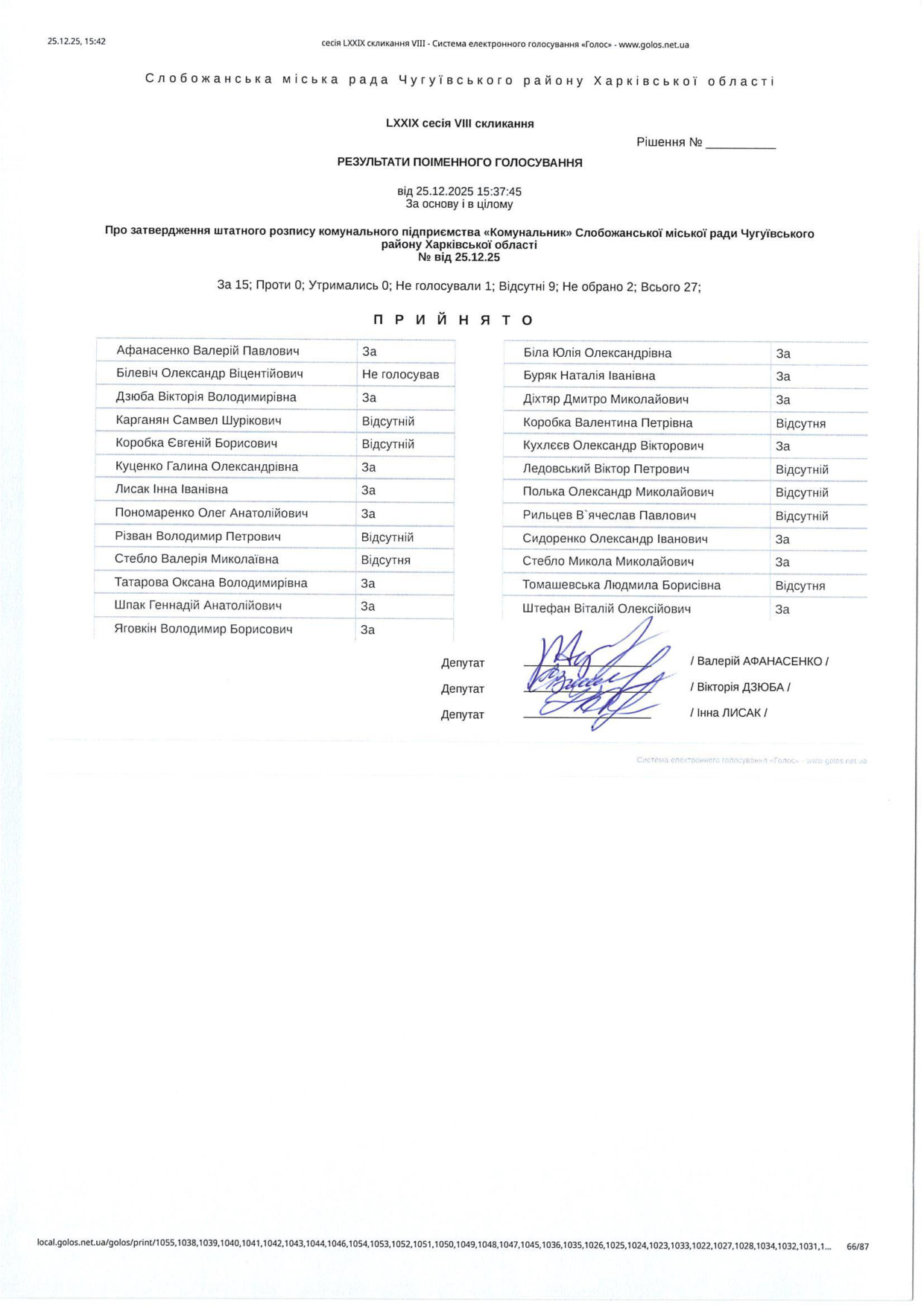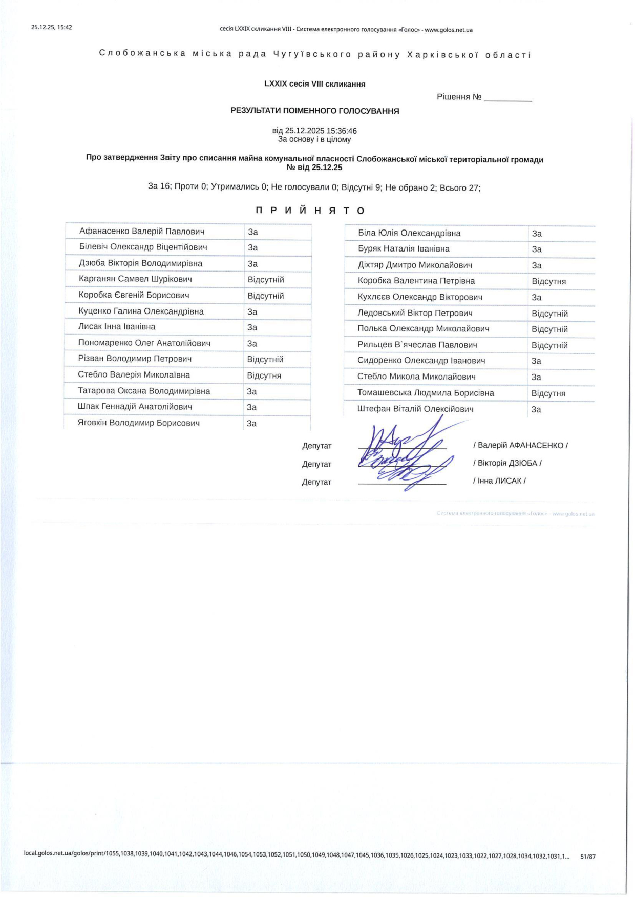 Відомості голосування до рішення сесії №3352 Про затвердження Заходів на 2026 рік до Програми підтримки Захисників і Захисниць України та членів їх сімей Слобожанської міської територіальної громади Чугуївського району Харківської області на 2026- 2030 роки