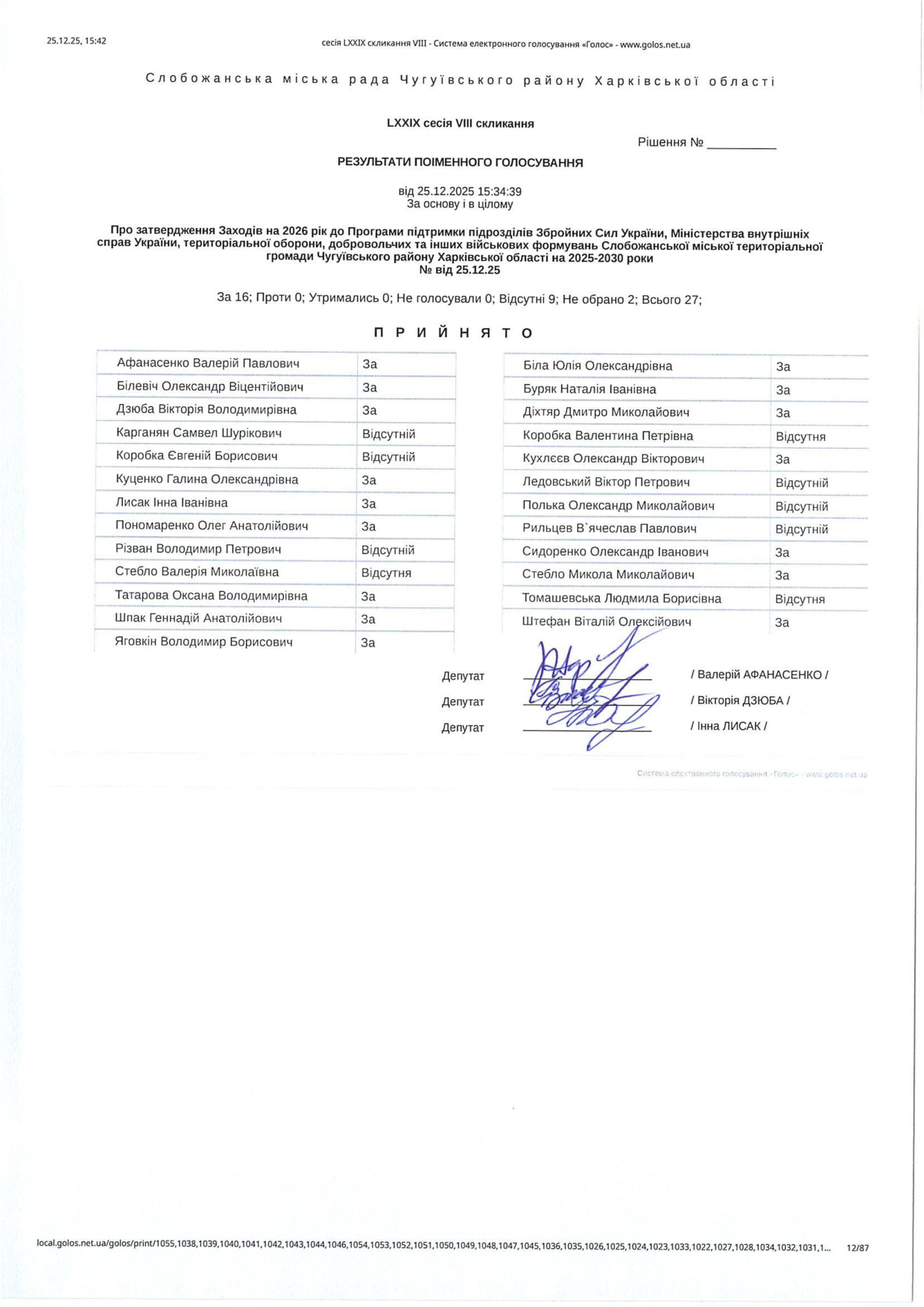 Відомості голосування до рішення сесії №3349 Про затвердження Заходів на 2026 рік до Програми підтримки підрозділів Збройних Сил України, Міністерства внутрішніх справ України, територіальної оборони, добровольчих та інших військових формувань Слобожанської міської територіальної громади Чугуївського району Харківської області на 2025-2030 роки