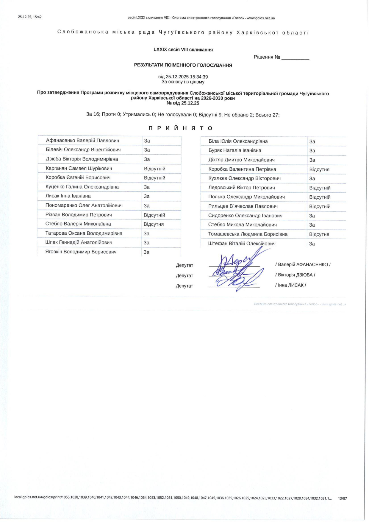 Відомості голосування до рішення сесії №3350 Про затвердження Програми розвитку місцевого самоврядування Слобожанської міської територіальної громади Чугуївського району Харківської області на 2026-2030 роки