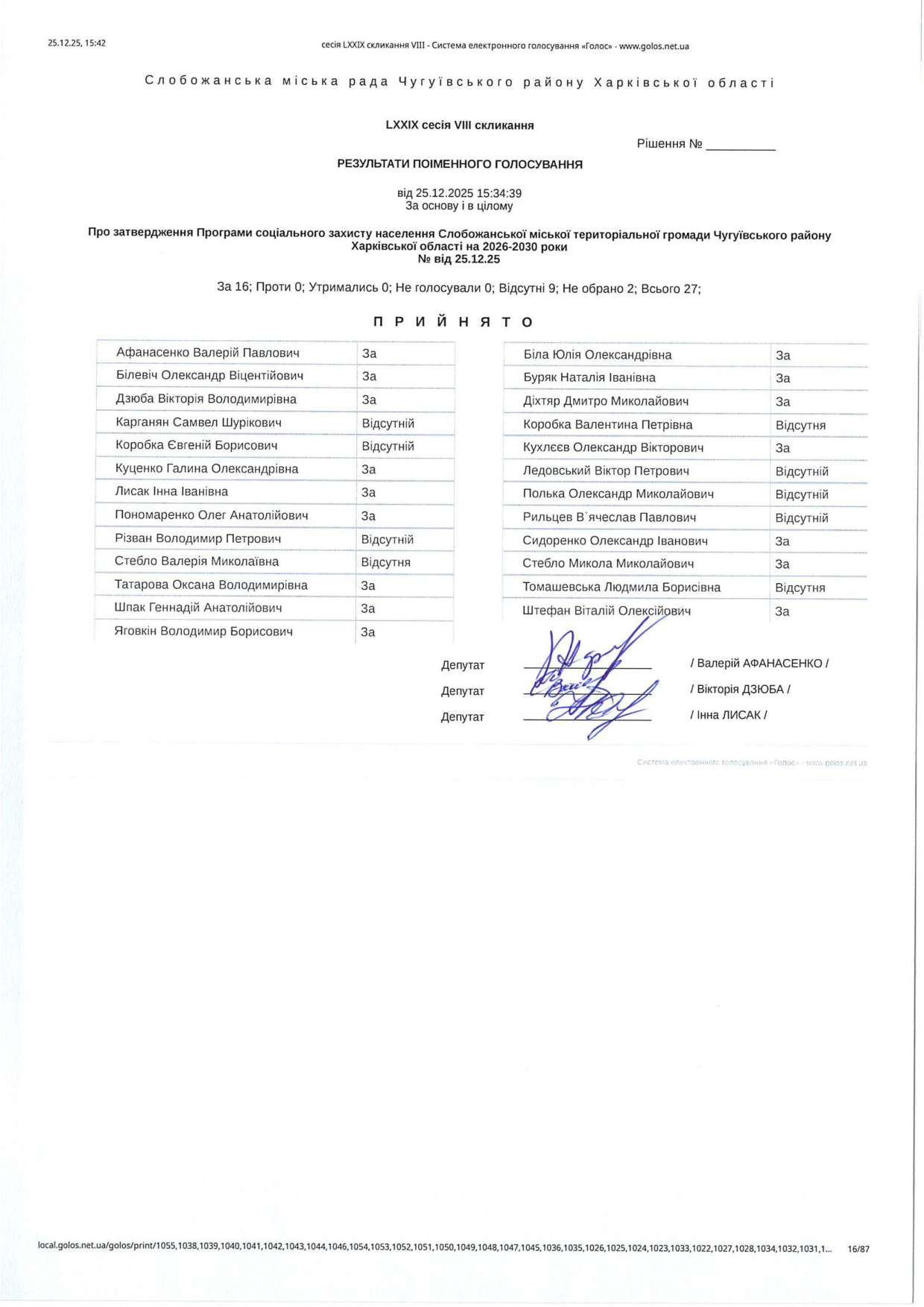 Відомості голосування до рішення сесії №3353 Про затвердження Програми соціального захисту населення Слобожанської міської територіальної громади Чугуївського району Харківської області на 2026-2030 роки