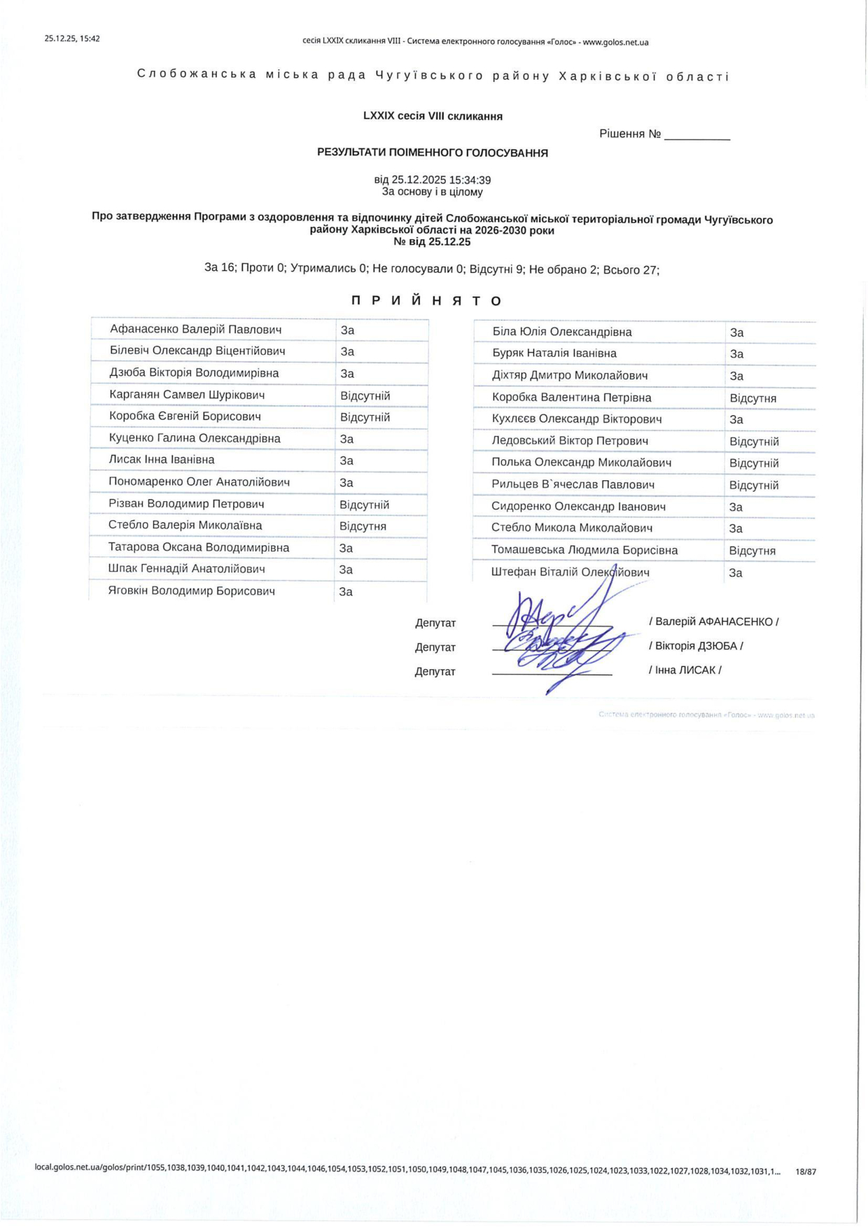Відомості голосування до рішення сесії №3356 Про затвердження Заходів на 2026 рік до Програми з оздоровлення та відпочинку дітей Слобожанської міської територіальної громади Чугуївського району Харківської області на 2026 - 2030 роки