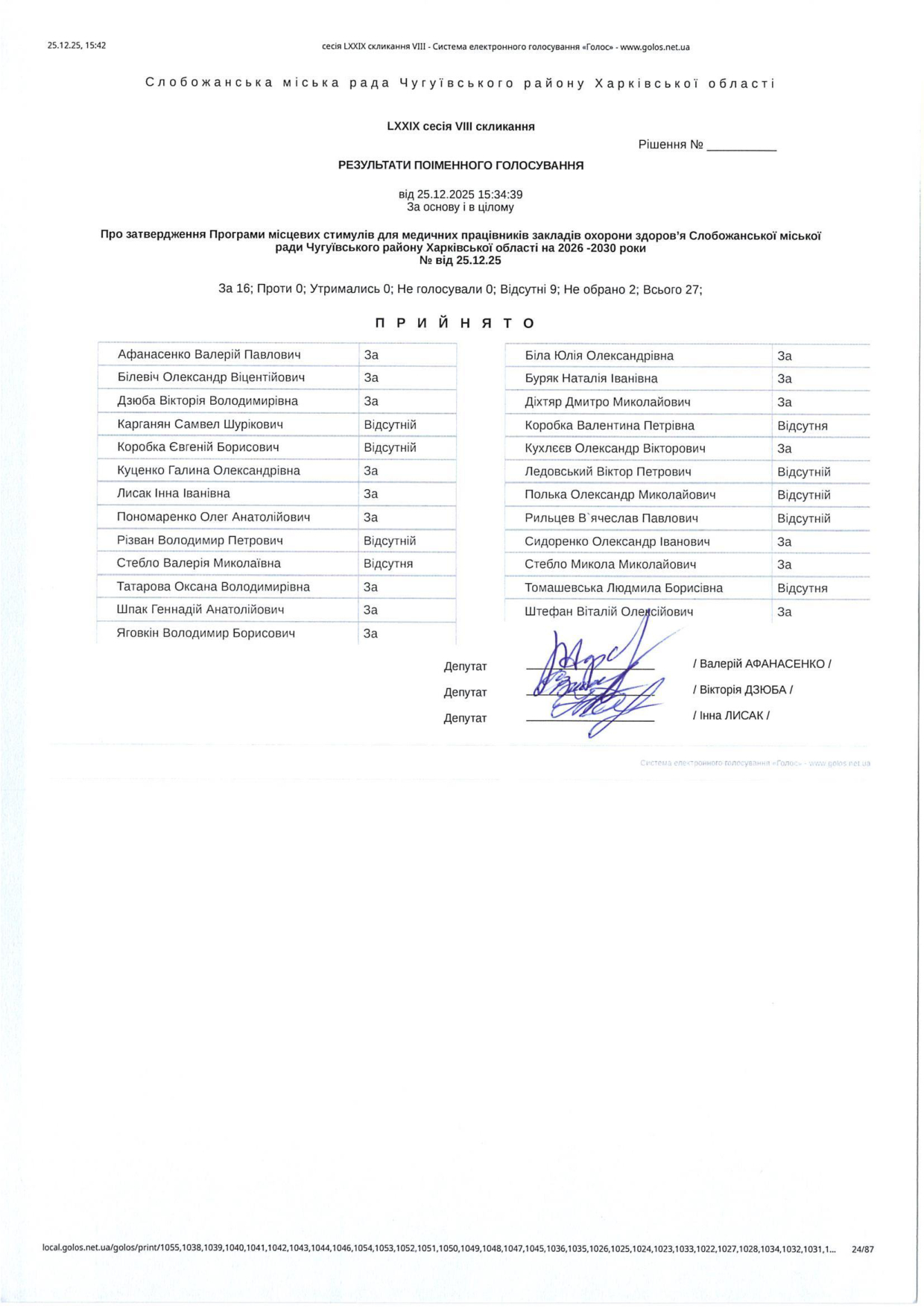 Відомості голосування до рішення сесії №3359 Про затвердження Програми розвитку та підтримки комунальних закладів охорони здоров’я Слобожанської міської ради Чугуївського району Харківської області на 2026 – 2030 роки
