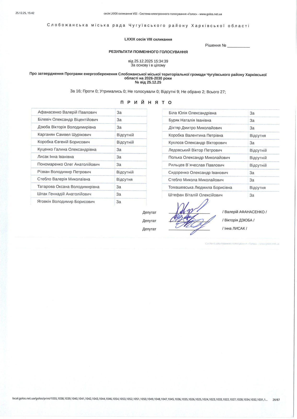 Відомості голосування до рішення сесії №3363 Про затвердження Програми енергозбереження Слобожанської міської територіальної громади Чугуївського району Харківської області на 2026-2030 роки