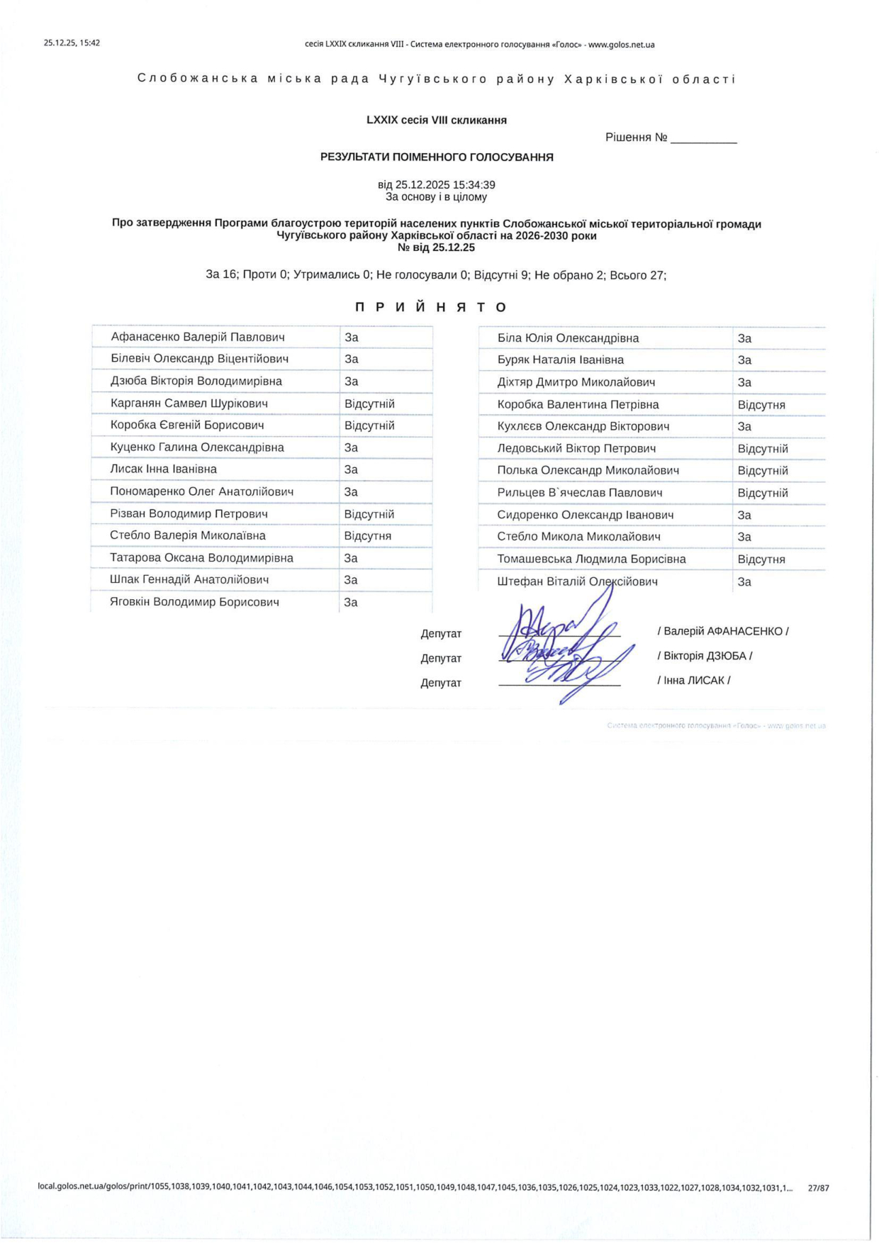 Відомості голосування до рішення сесії №3364 Про затвердження Програми благоустрою територій населених пунктів Слобожанської міської територіальної громади Чугуївського району Харківської області на 2026-2030 роки