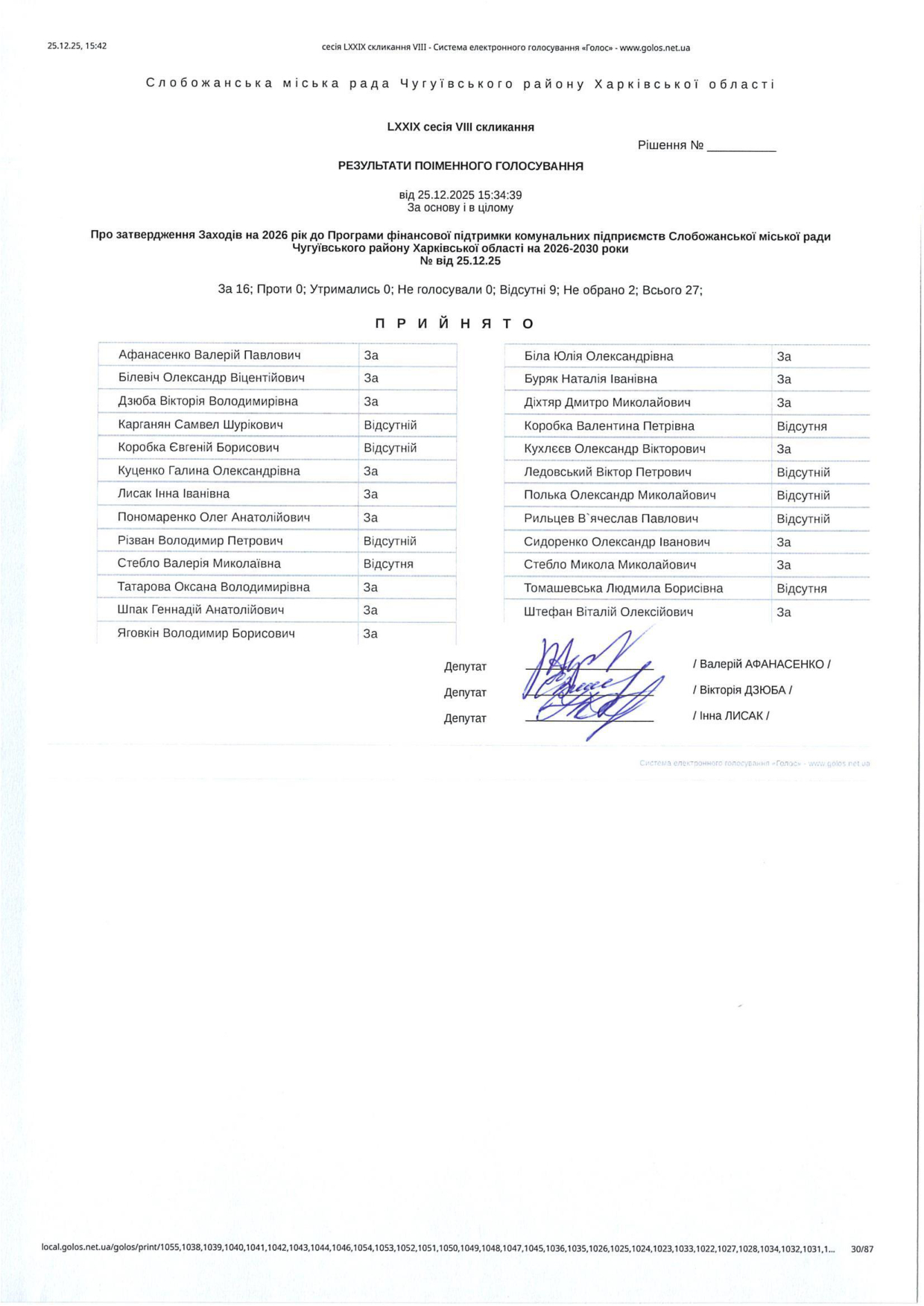 Відомості голосування до рішення сесії №3367 Про затвердження Заходів на 2026 рік до Програми фінансової підтримки комунальних підприємств Слобожанської міської ради Чугуївського району Харківської області на 2026-2030 роки