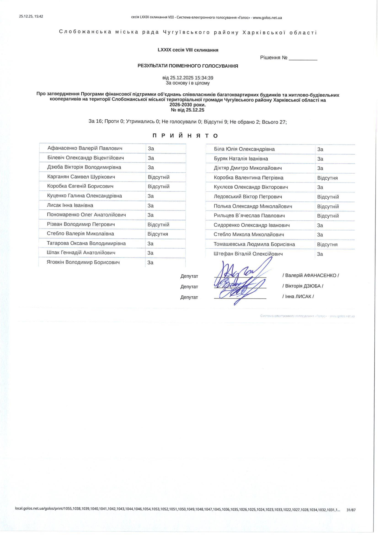 Відомості голосування до рішення сесії №3368 Про затвердження Програми фінансової підтримки об’єднань співвласників багатоквартирних будинків та житлово-будівельних кооперативів на території Слобожанської міської територіальної громади Чугуївського району Харківської області на 2026-2030 роки