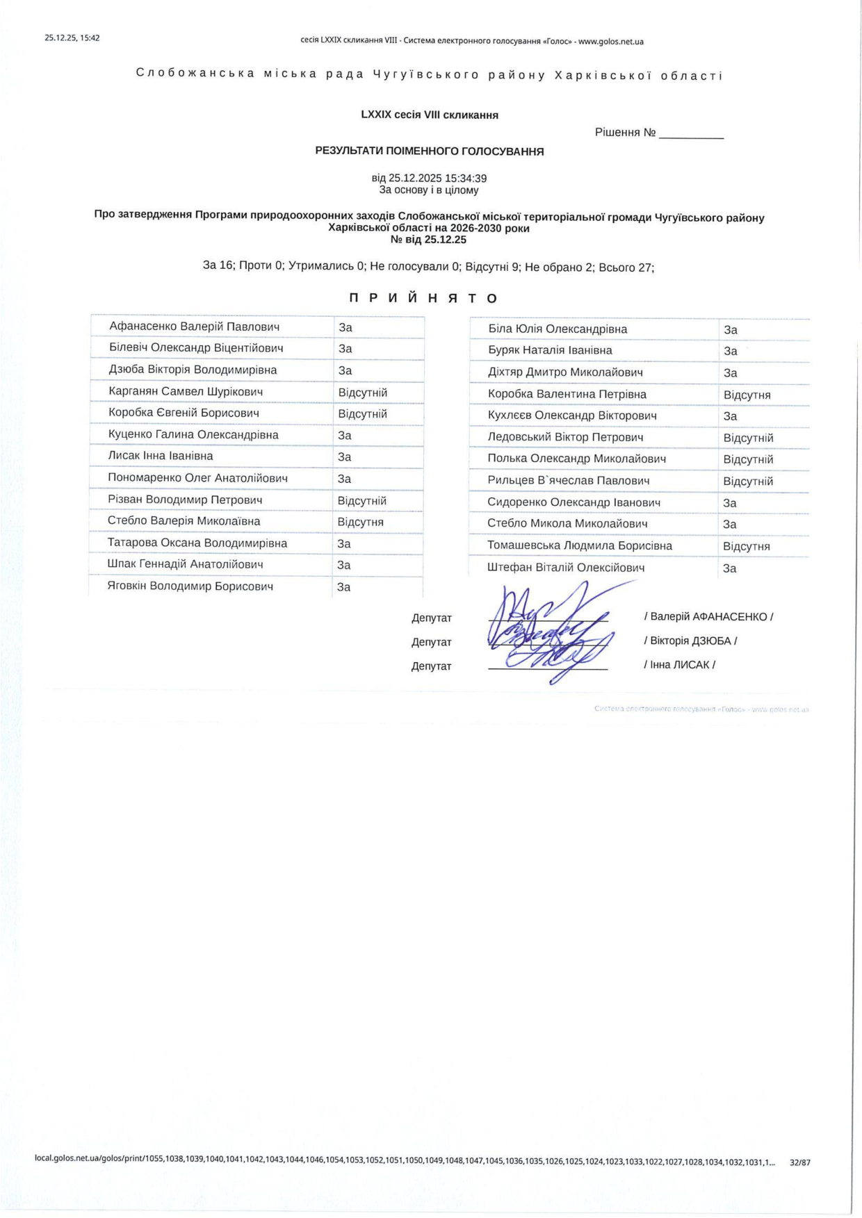 Відомості голосування до рішення сесії №3370 Про затвердження Заходів на 2026 рік до Програми природоохоронних заходів Слобожанської міської територіальної громади Чугуївського району Харківської області на 2026-2030 роки