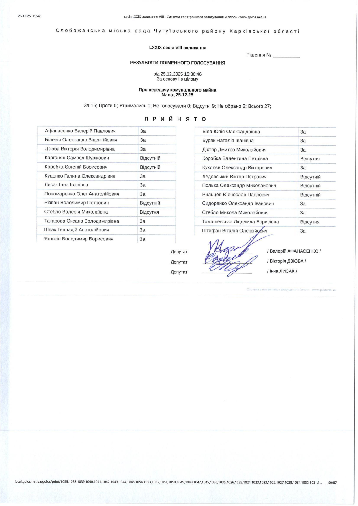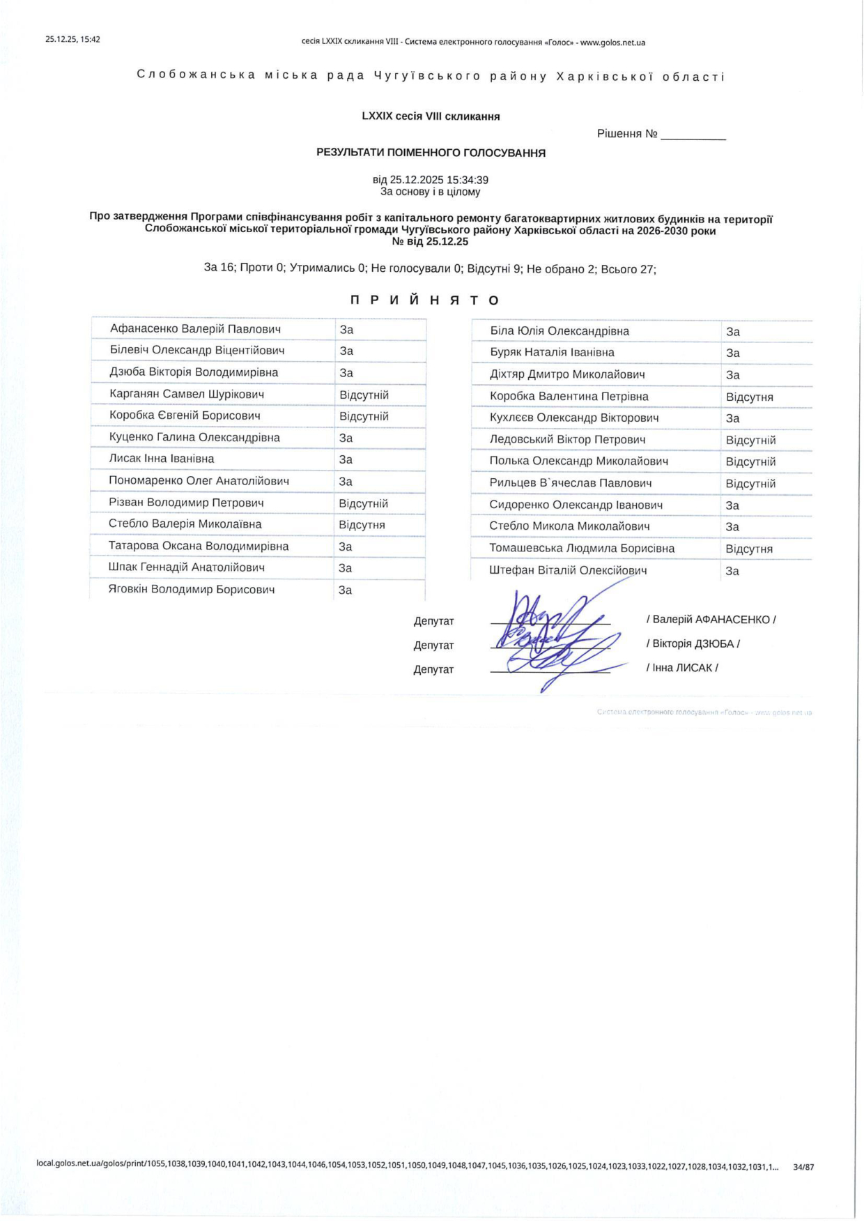 Відомості голосування до рішення сесії №3371 Про затвердження Програми співфінансування робіт з капітального ремонту багатоквартирних житлових будинків на території Слобожанської міської територіальної громади Чугуївського району Харківської області на 2026-2030 роки