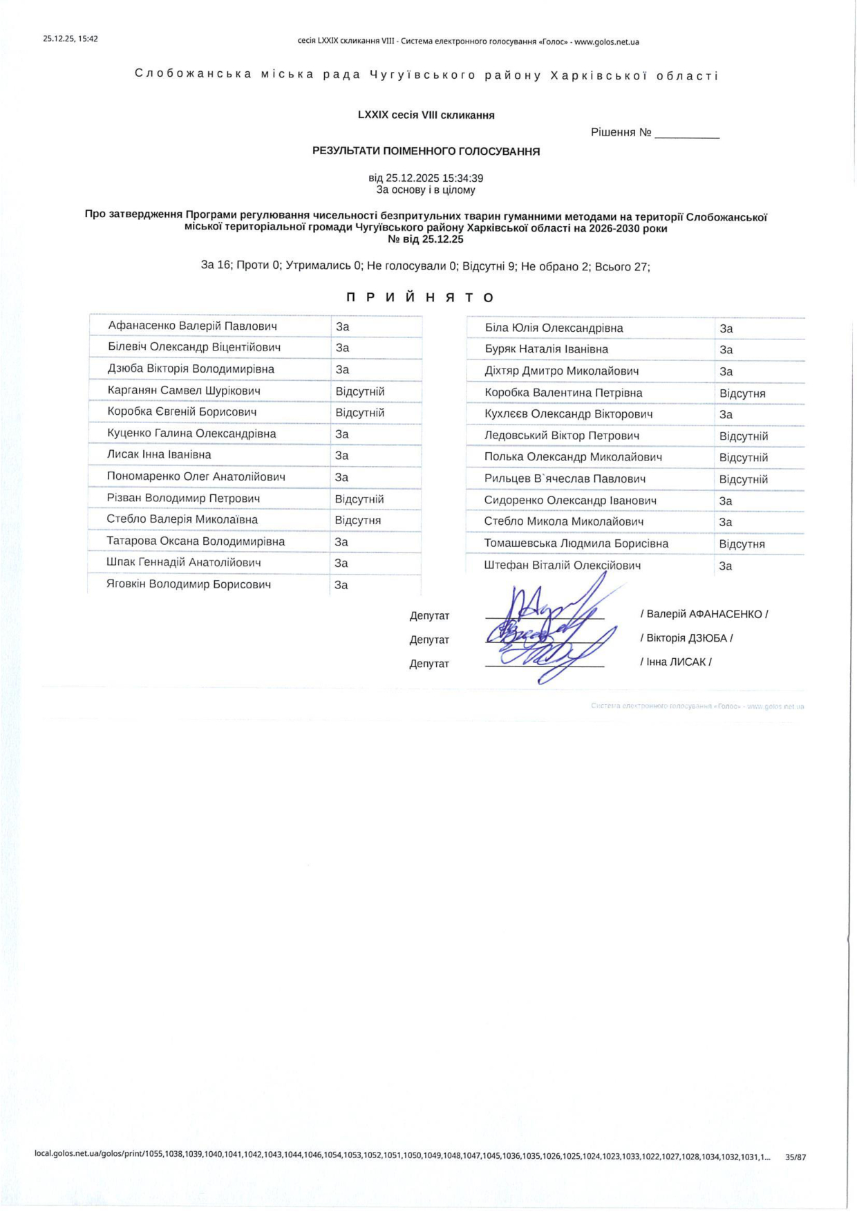 Відомості голосування до рішення сесії №3372 Про затвердження Програми регулювання чисельності безпритульних тварин гуманними методами на території Слобожанської міської територіальної громади Чугуївського району Харківської області на 2026-2030 роки
