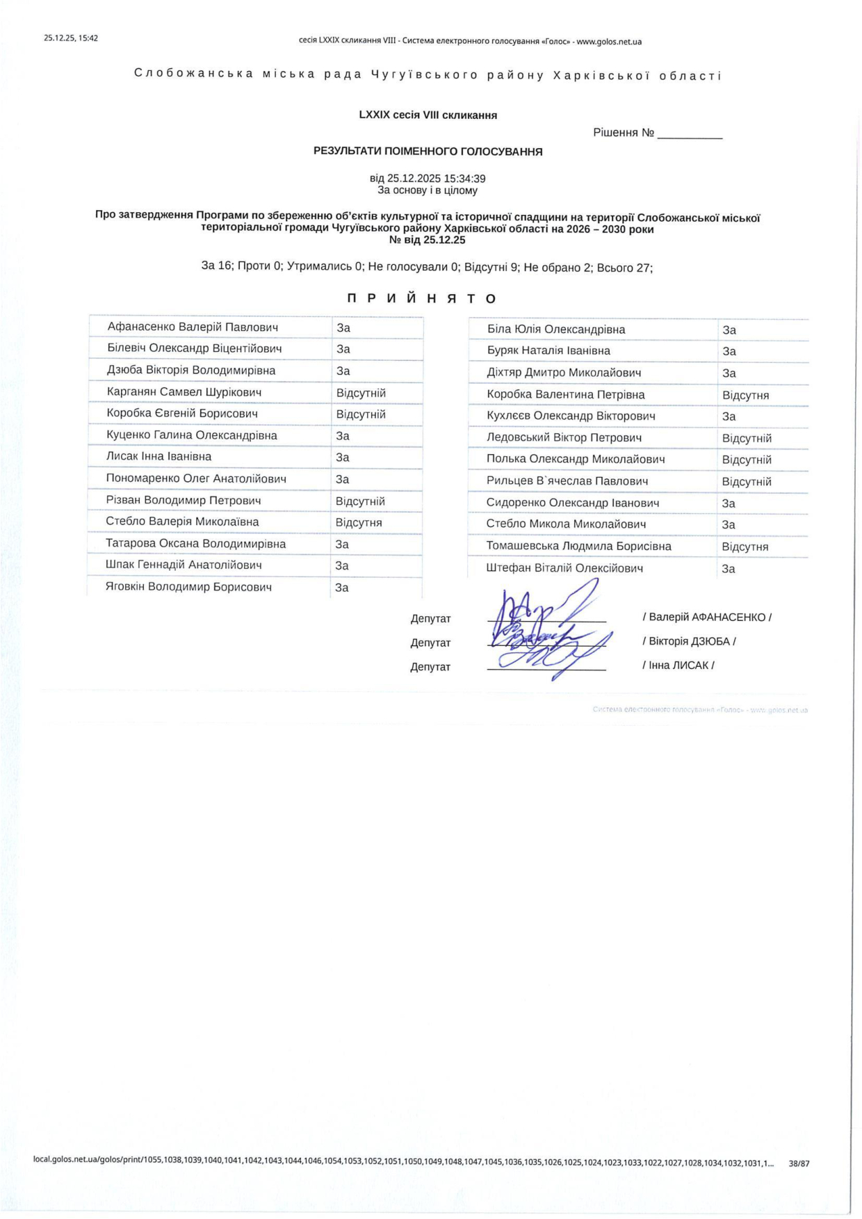 Відомості голосування до рішення сесії №3375 Про затвердження Програми по збереженню об’єктів культурної та історичної спадщини на території Слобожанської міської територіальної громади Чугуївського району Харківської області на 2026 – 2030 роки