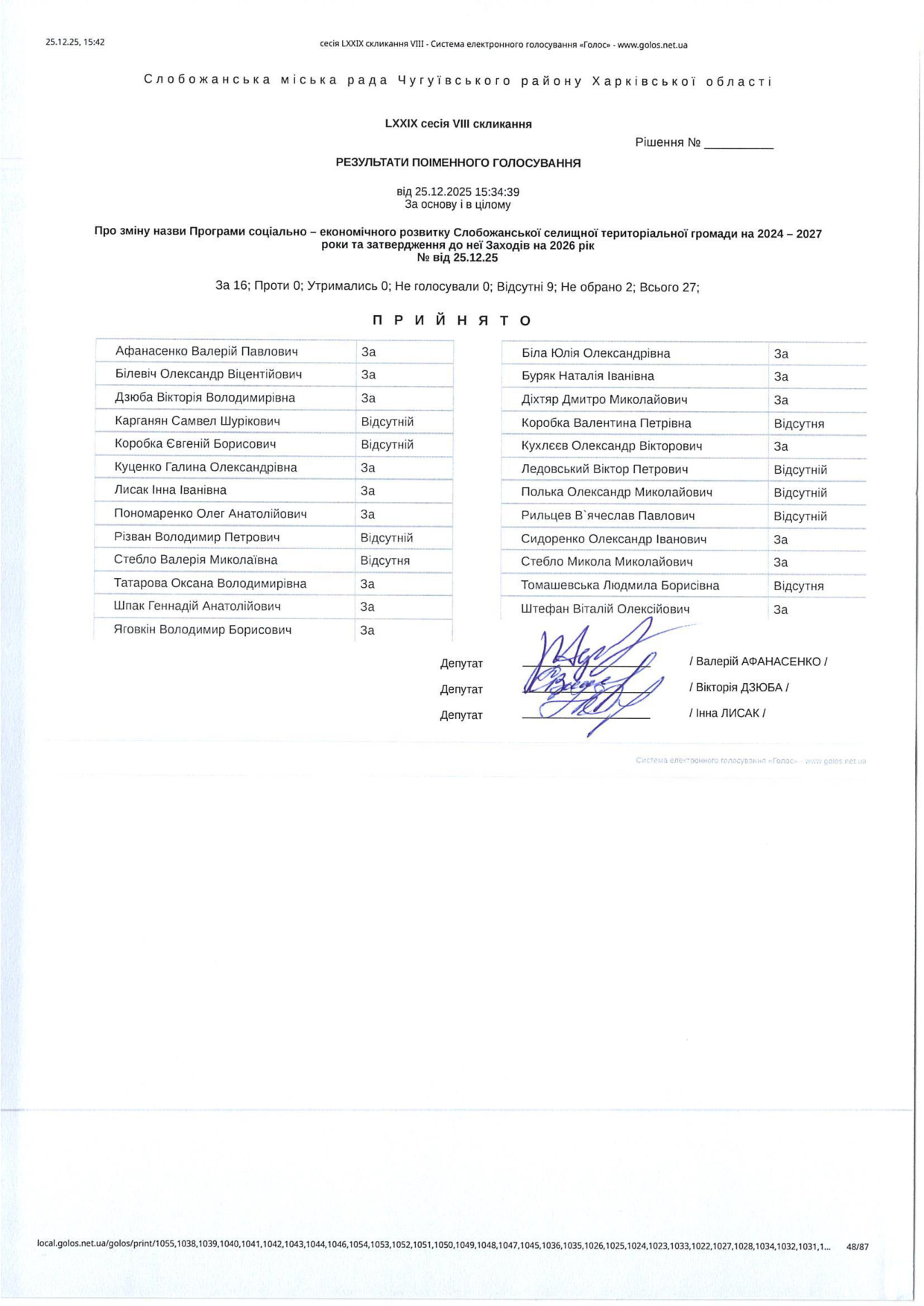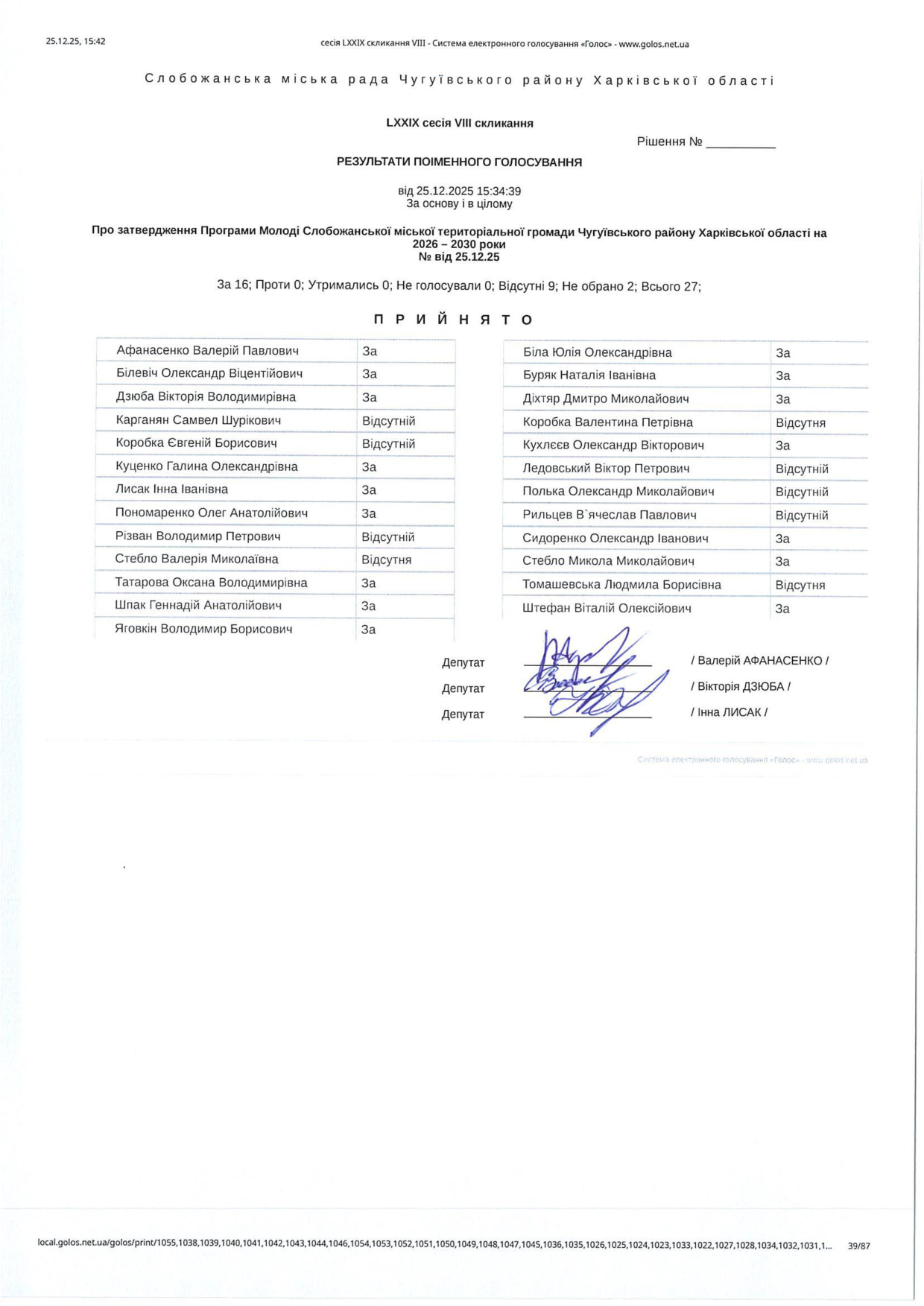 Відомості голосування до рішення сесії №3376 Про затвердження Програми Молоді Слобожанської міської територіальної громади Чугуївського району Харківської області на 2026 – 2030 роки