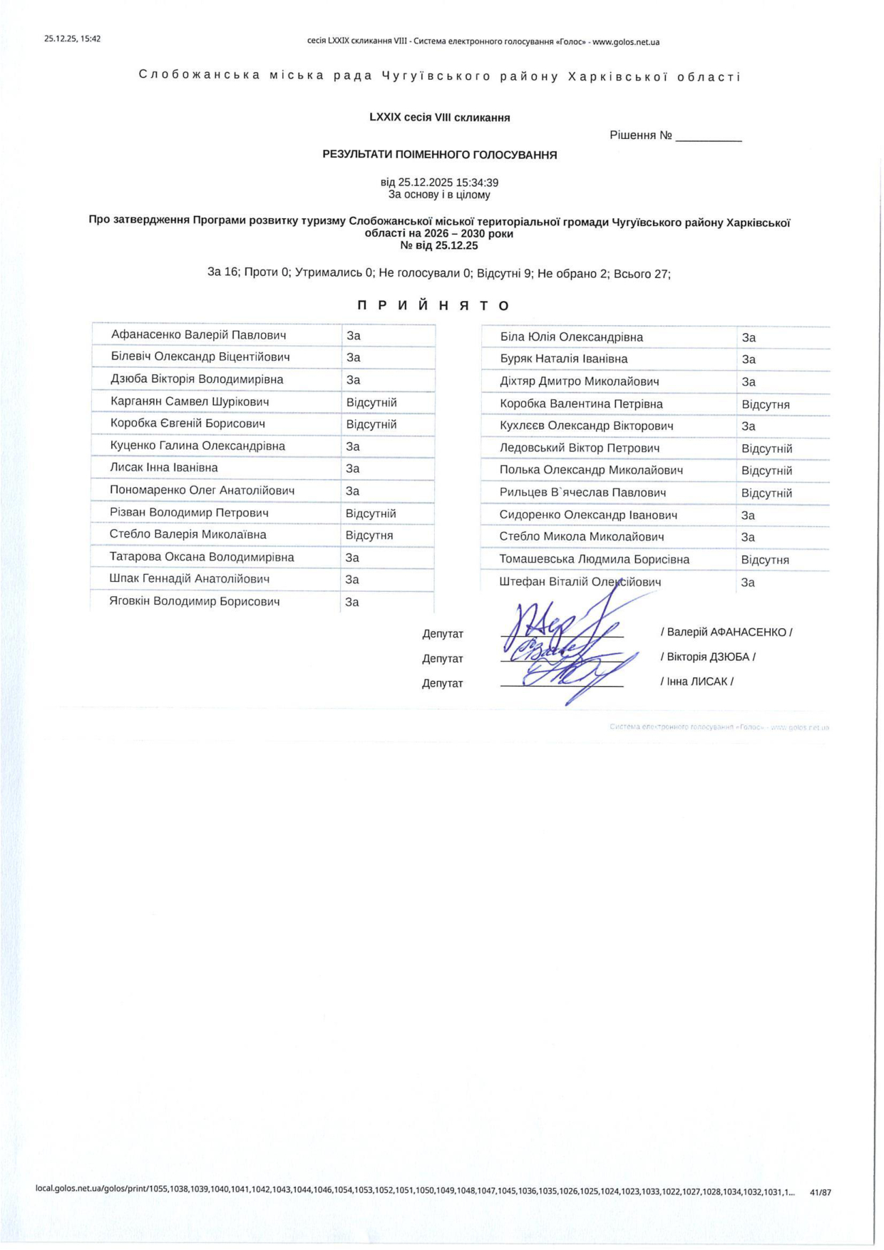 Відомості голосування до рішення сесії №3378 Про затвердження Програми розвитку туризму Слобожанської міської територіальної громади Чугуївського району Харківської області на 2026 – 2030 роки