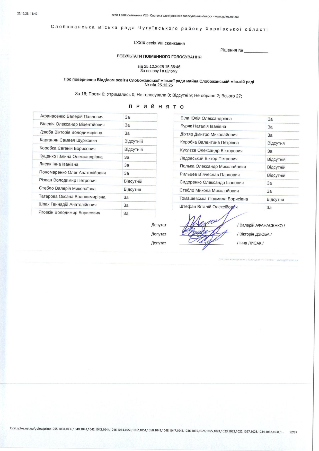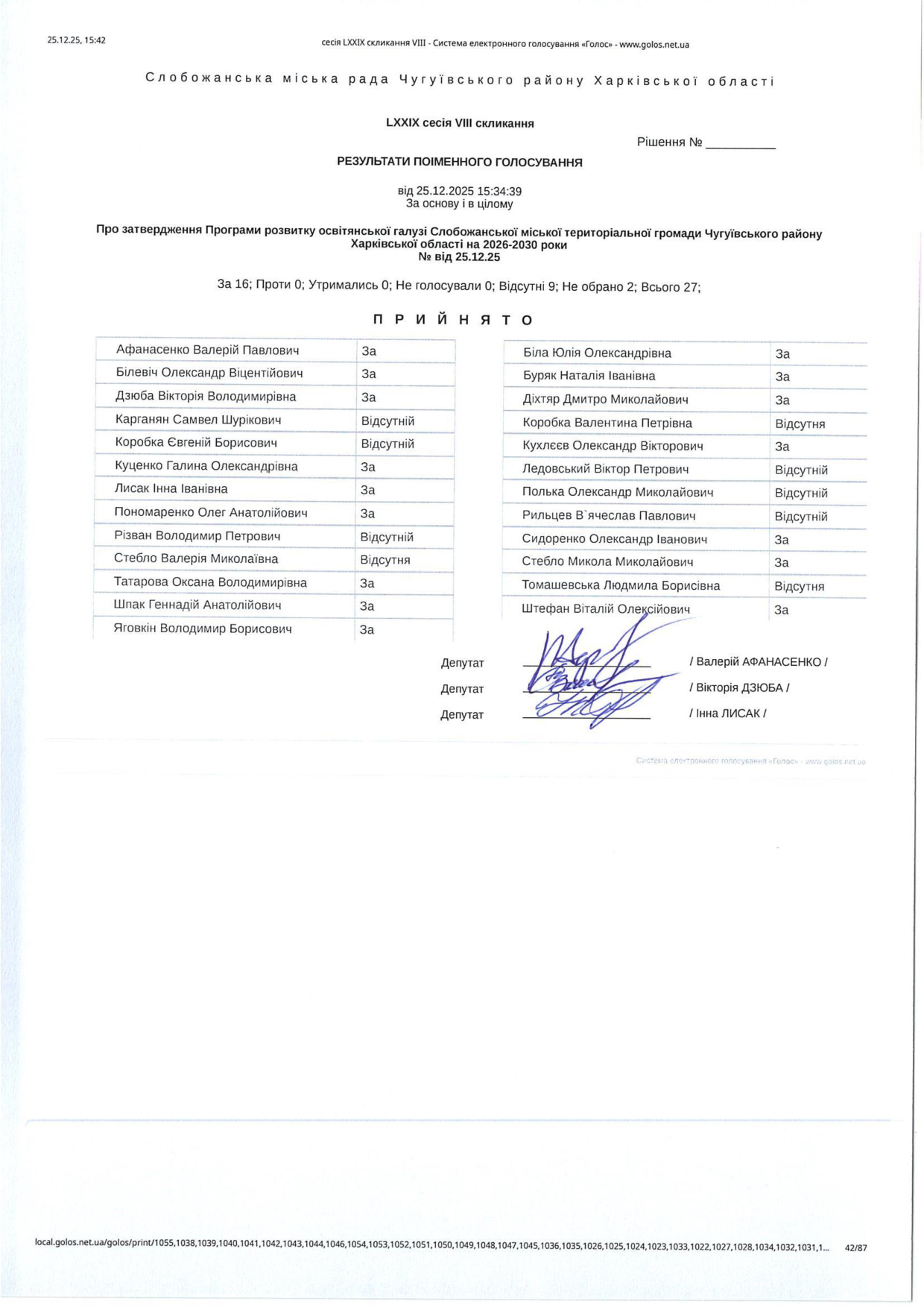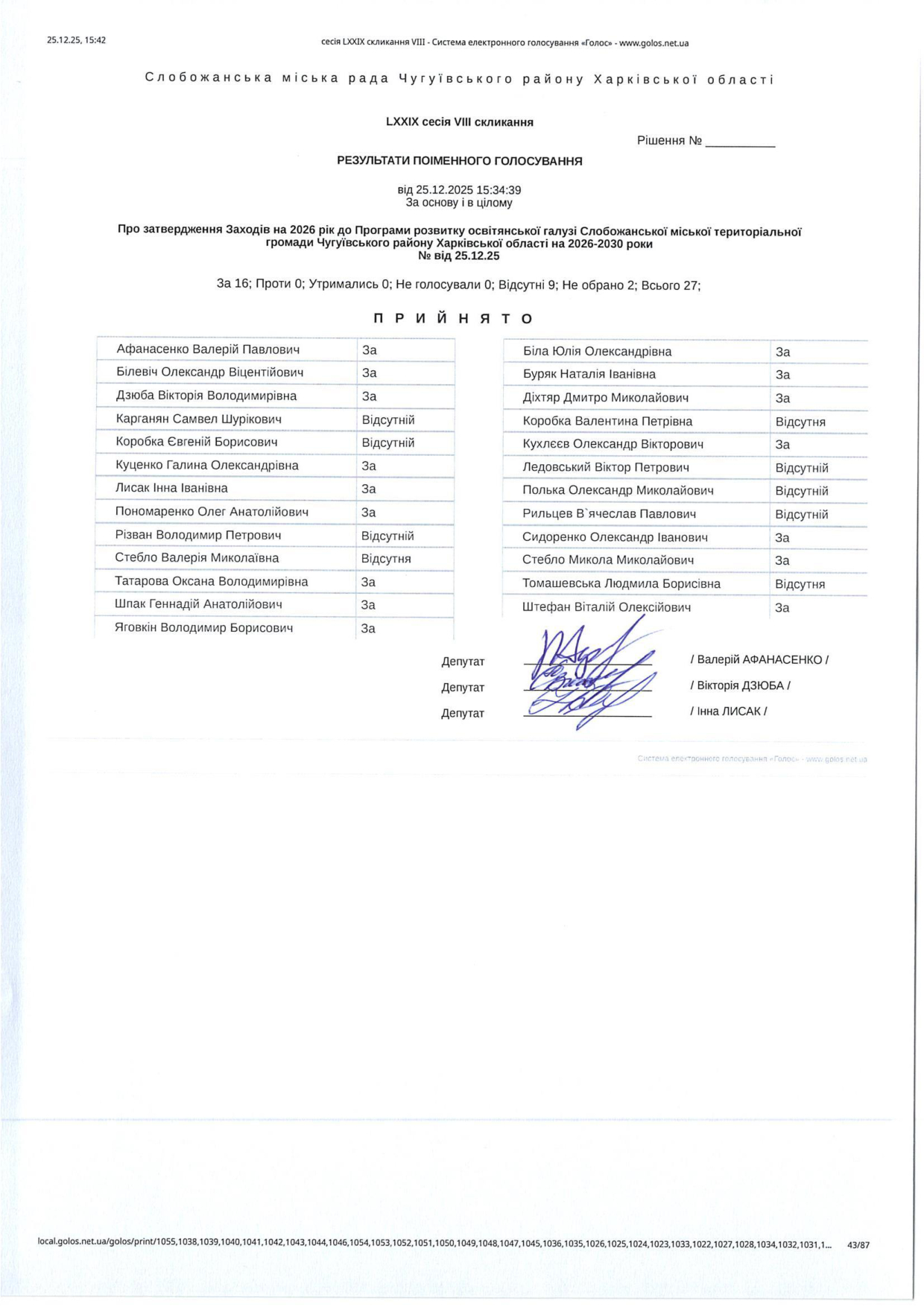 Відомості голосування до рішення сесії №3380 Про затвердження Заходів на 2026 рік до Програми розвитку освітянської галузі Слобожанської міської територіальної громади Чугуївського району Харківської області на 2026-2030 роки