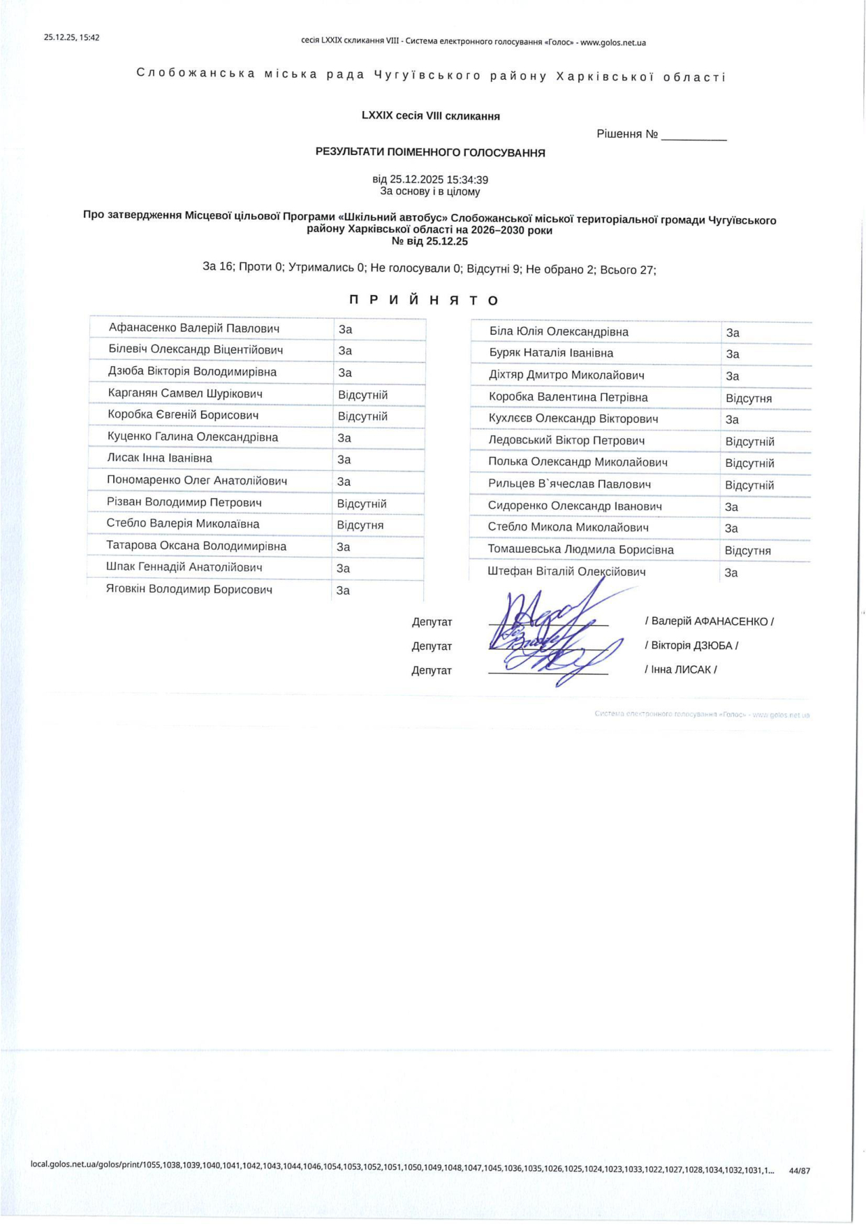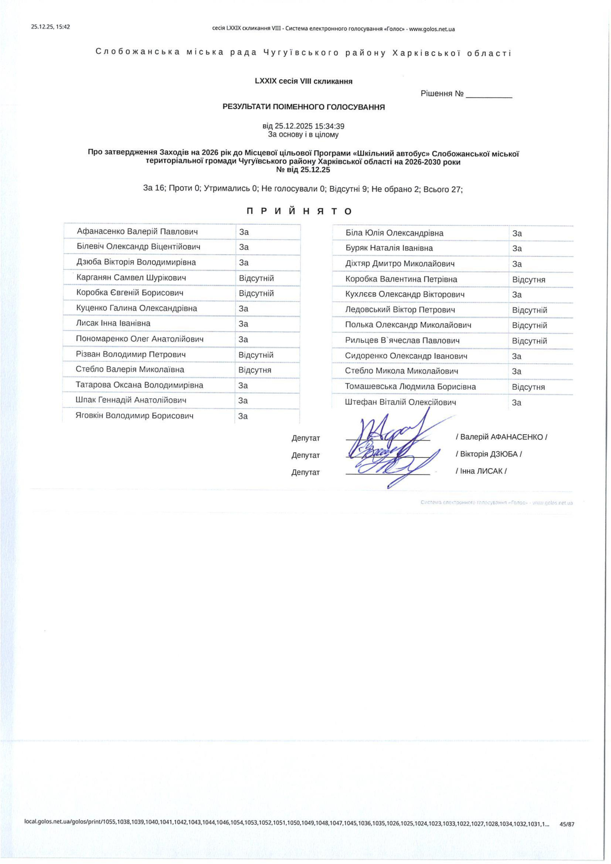 Відомості голосування до рішення сесії №3381 Про затвердження Місцевої цільової Програми «Шкільний автобус» Слобожанської міської територіальної громади Чугуївського району Харківської області на 2026–2030 роки