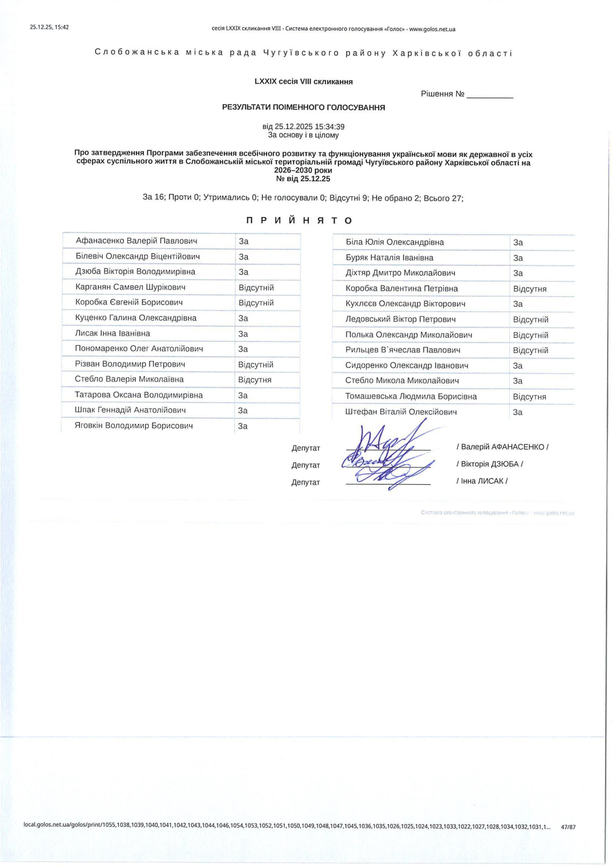 Відомості голосування до рішення сесії №3384 Про затвердження Програми забезпечення всебічного розвитку та функціонування української мови як державної в усіх сферах суспільного життя в Слобожанській міської територіальній громаді Чугуївського району Харківської області на 2026–2030 роки