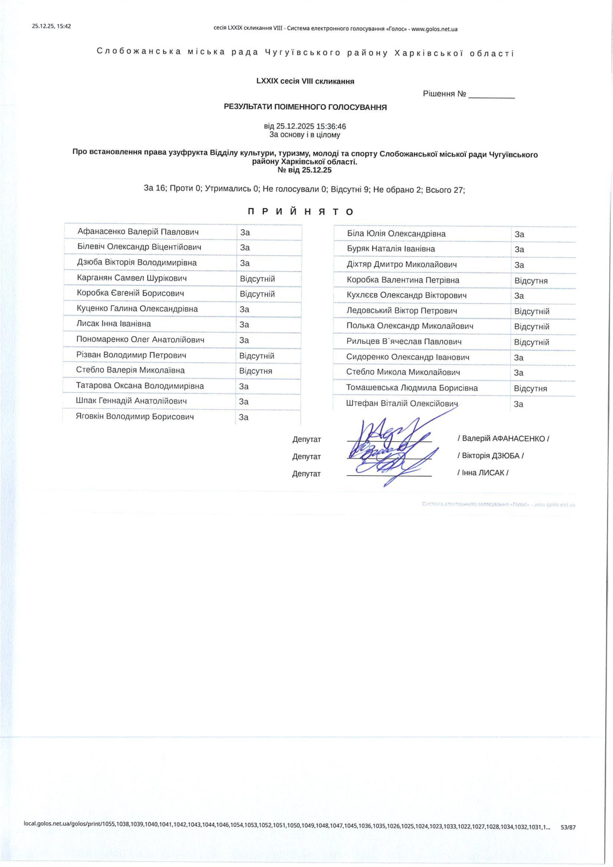 Відомості голосування до рішення сесії №3390 Про встановлення права узуфрукта Відділу культури, туризму, молоді та спорту Слобожанської міської ради Чугуївського району Харківської області
