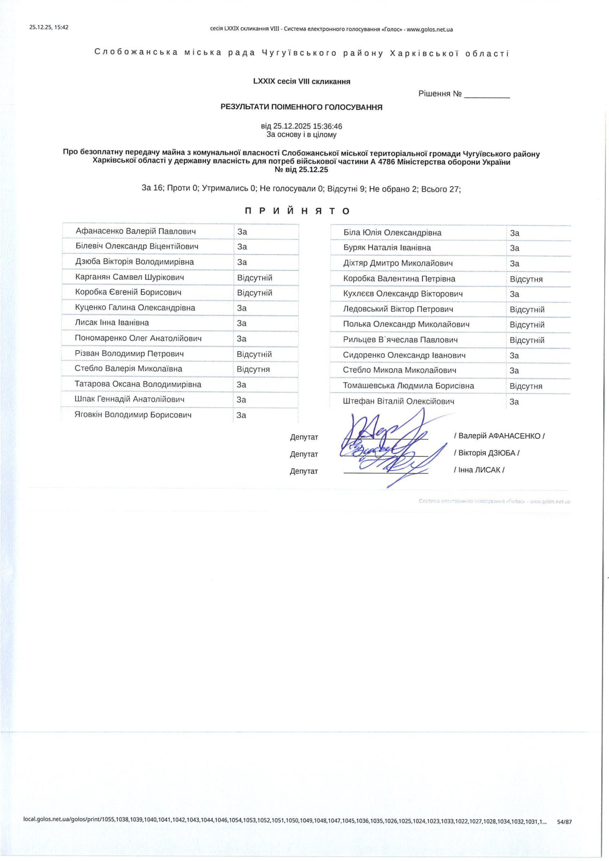 Відомості голосування до рішення сесії №3391 Про безоплатну передачу майна з комунальної власності Слобожанської міської територіальної громади Чугуївського району Харківської області у державну власність для потреб військової частини А 4786 Міністерства оборони України