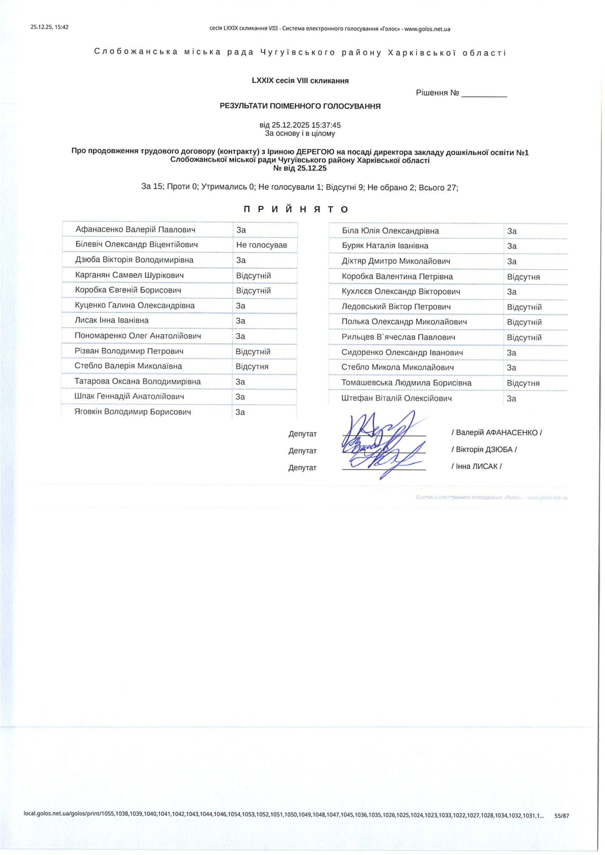Відомості голосування до рішення сесії №3392 Про продовження трудового договору (контракту) з Іриною ДЕРЕГОЮ на посаді директора закладу дошкільної освіти №1 Слобожанської міської ради Чугуївського району Харківської області