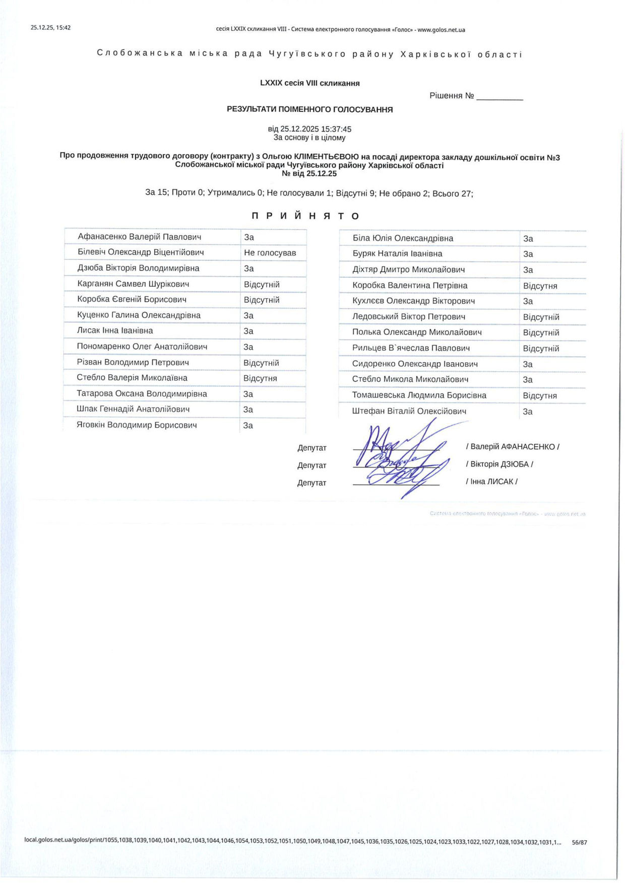 Відомості голосування до рішення сесії №3393 Про продовження трудового договору (контракту) з Ольгою КЛІМЕНТЬЄВОЮ на посаді директора закладу дошкільної освіти №3 Слобожанської міської ради Чугуївського району Харківської області