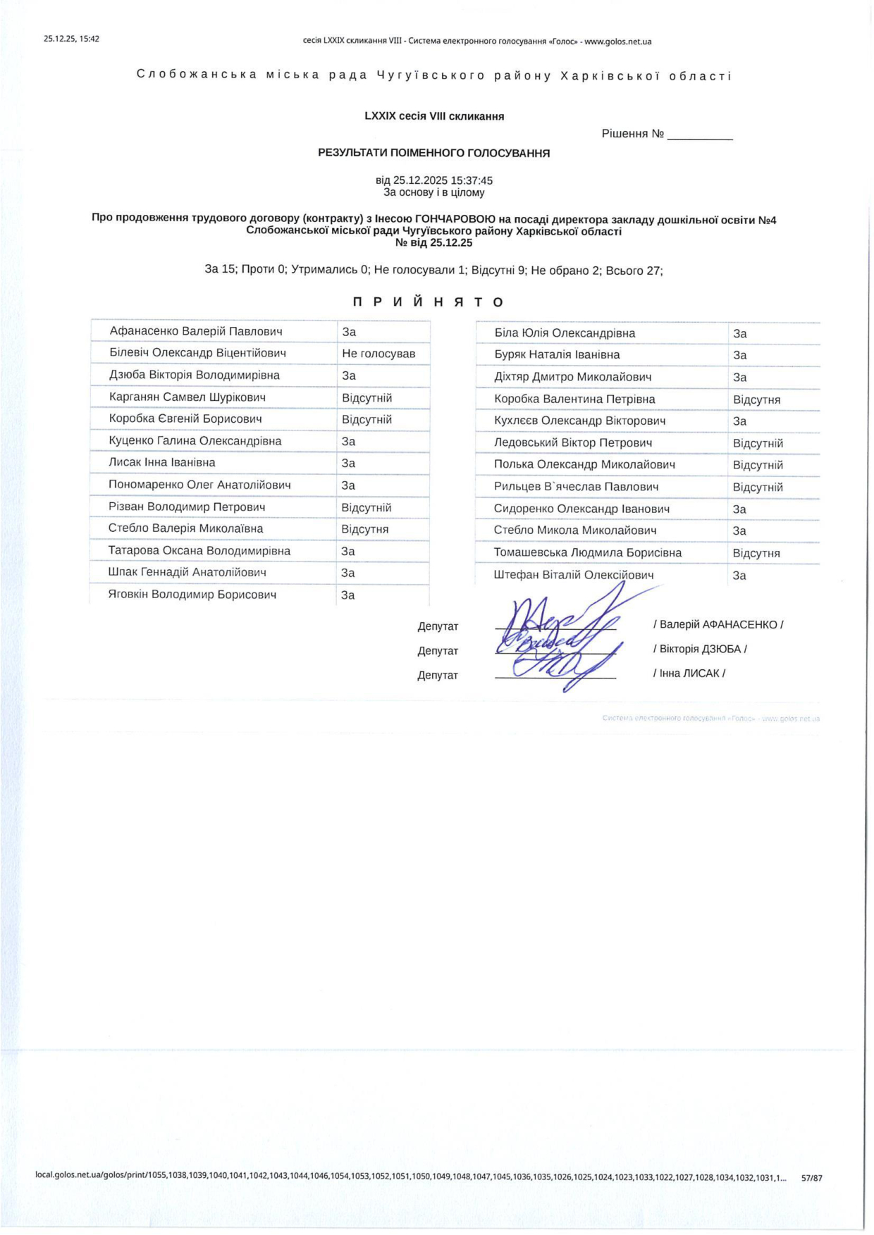 Відомості голосування до рішення сесії №3394 Про продовження трудового договору (контракту) з Інесою ГОНЧАРОВОЮ на посаді директора закладу дошкільної освіти №4 Слобожанської міської ради Чугуївського району Харківської області