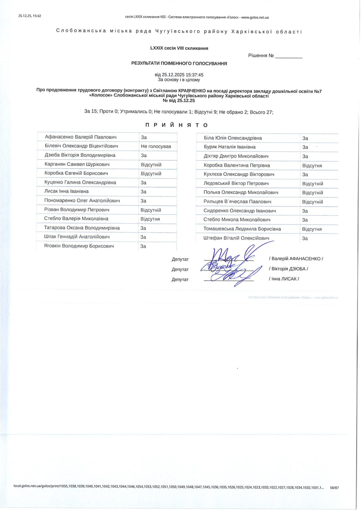 Відомості голосування до рішення сесії №3395 Про продовження трудового договору (контракту) з Світланою КРАВЧЕНКО на посаді директора закладу дошкільної освіти №7 «Колосок» Слобожанської міської ради Чугуївського району Харківської області