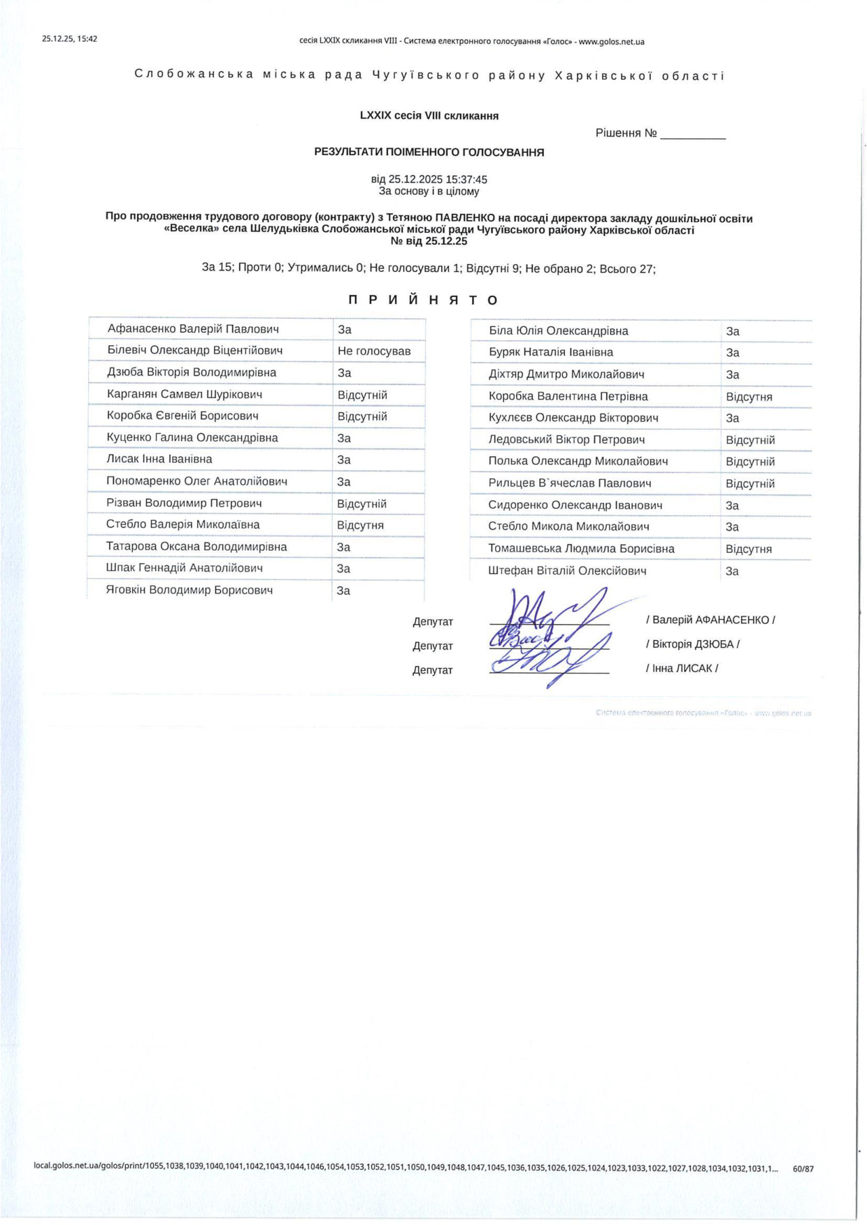 Відомості голосування до рішення сесії №3397 Про продовження трудового договору (контракту) з Тетяною ПАВЛЕНКО на посаді директора закладу дошкільної освіти «Веселка» села Шелудьківка Слобожанської міської ради Чугуївського району Харківської області