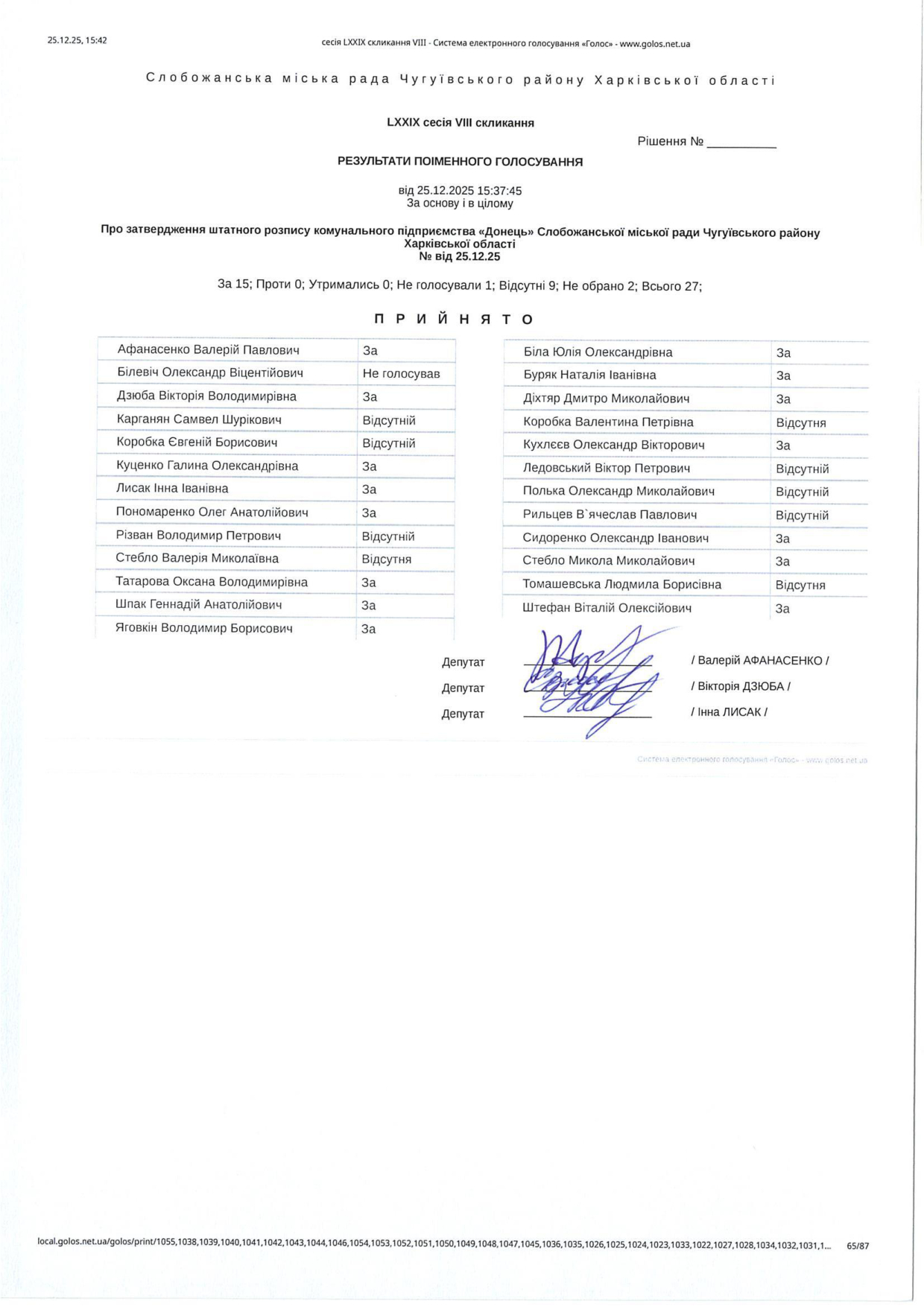 Відомості голосування до рішення сесії №3402 Про затвердження штатного розпису комунального підприємства «Донець» Слобожанської міської ради Чугуївського району Харківської області