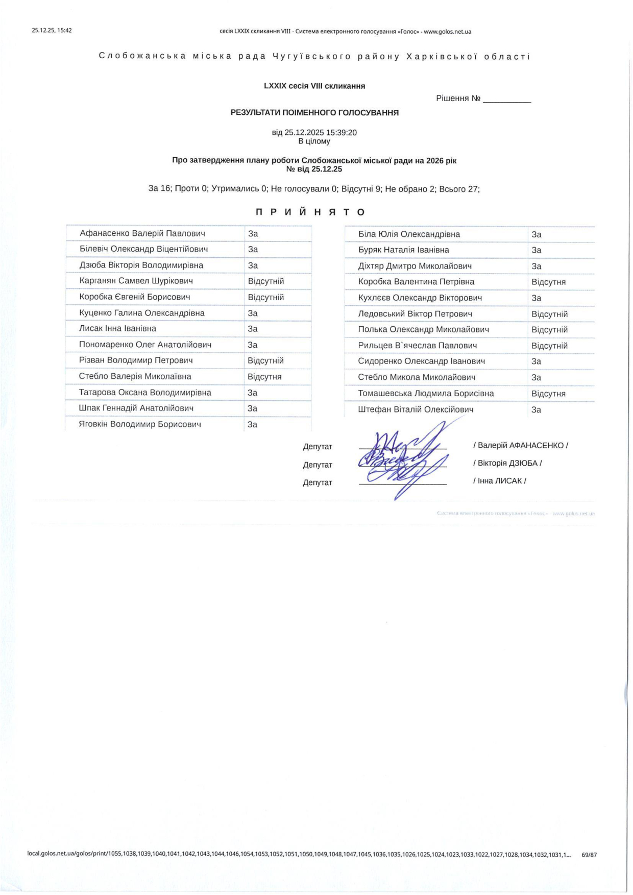 Відомості голосування до рішення сесії №3406 Про затвердження плану роботи Слобожанської міської ради на 2026 рік