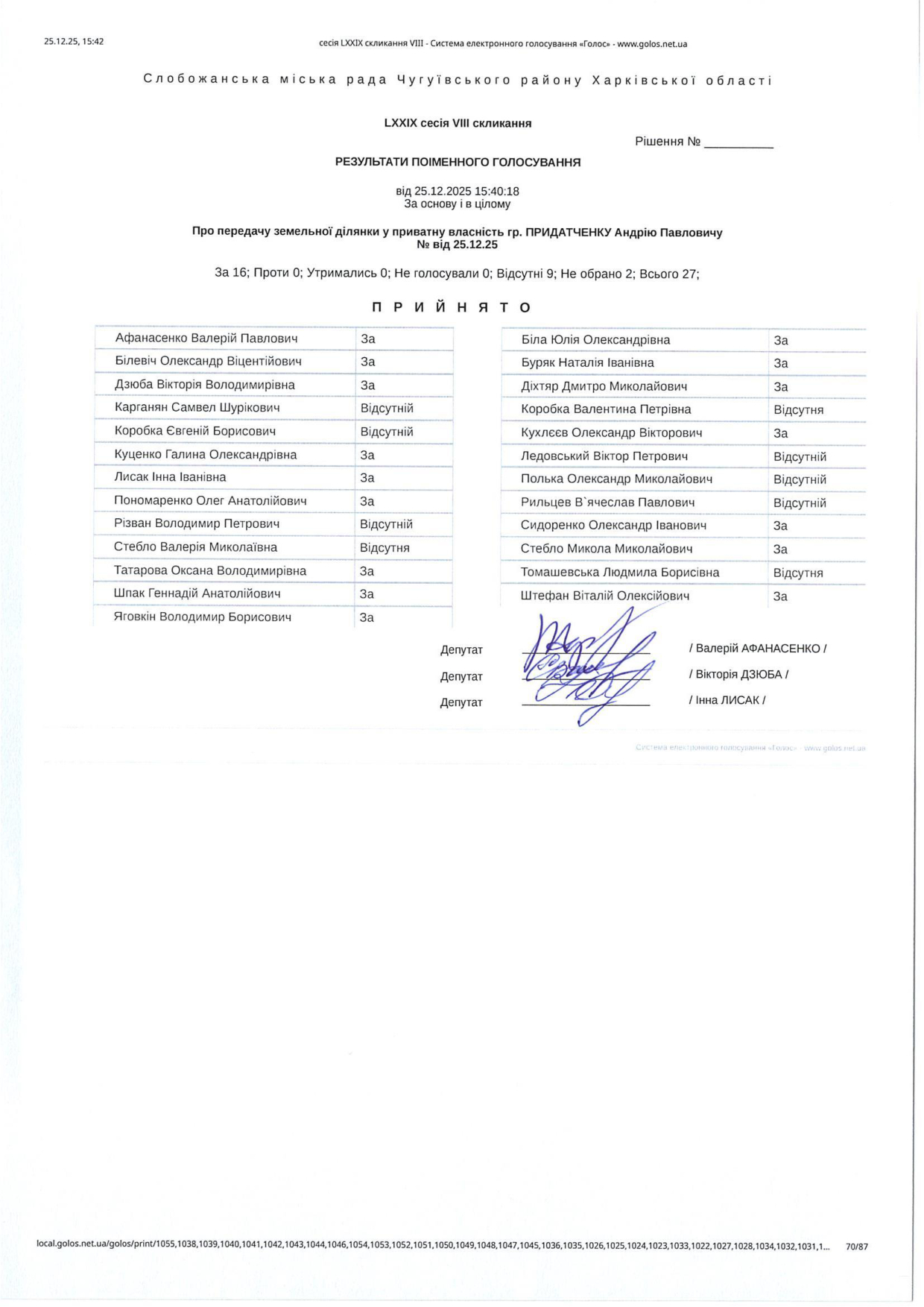 Відомості голосування до рішення сесії №3407 Про передачу земельної ділянки у приватну власність гр. ПРИДАТЧЕНКУ Андрію Павловичу