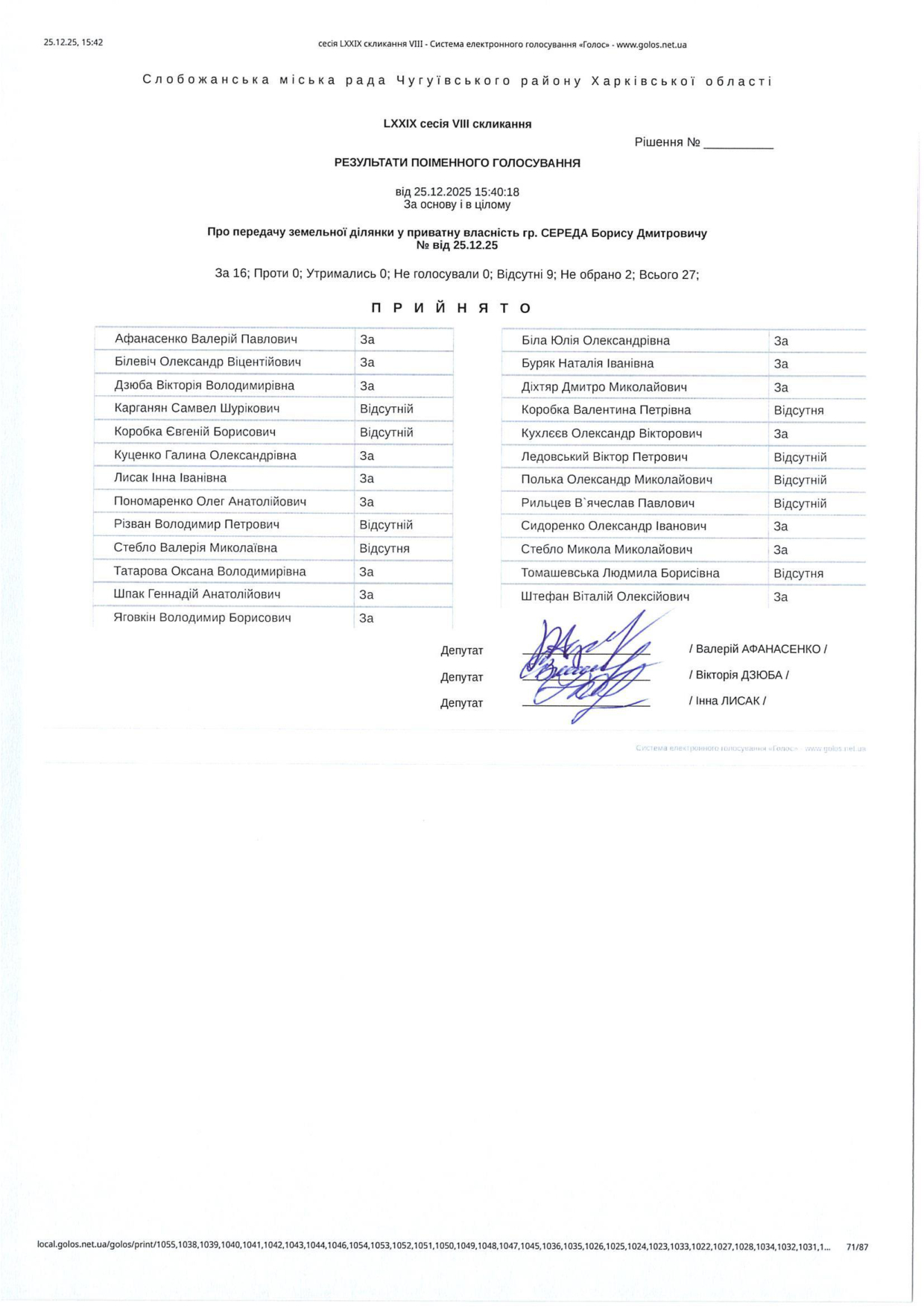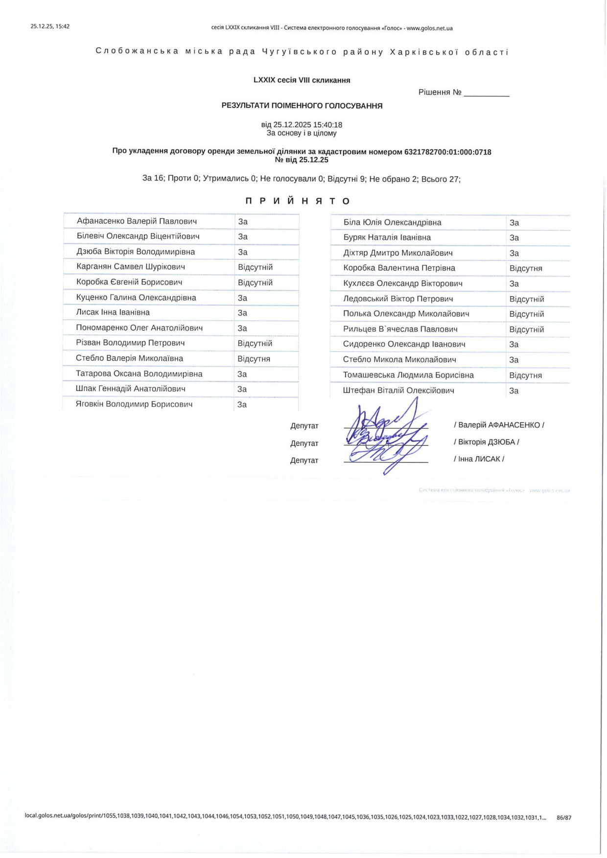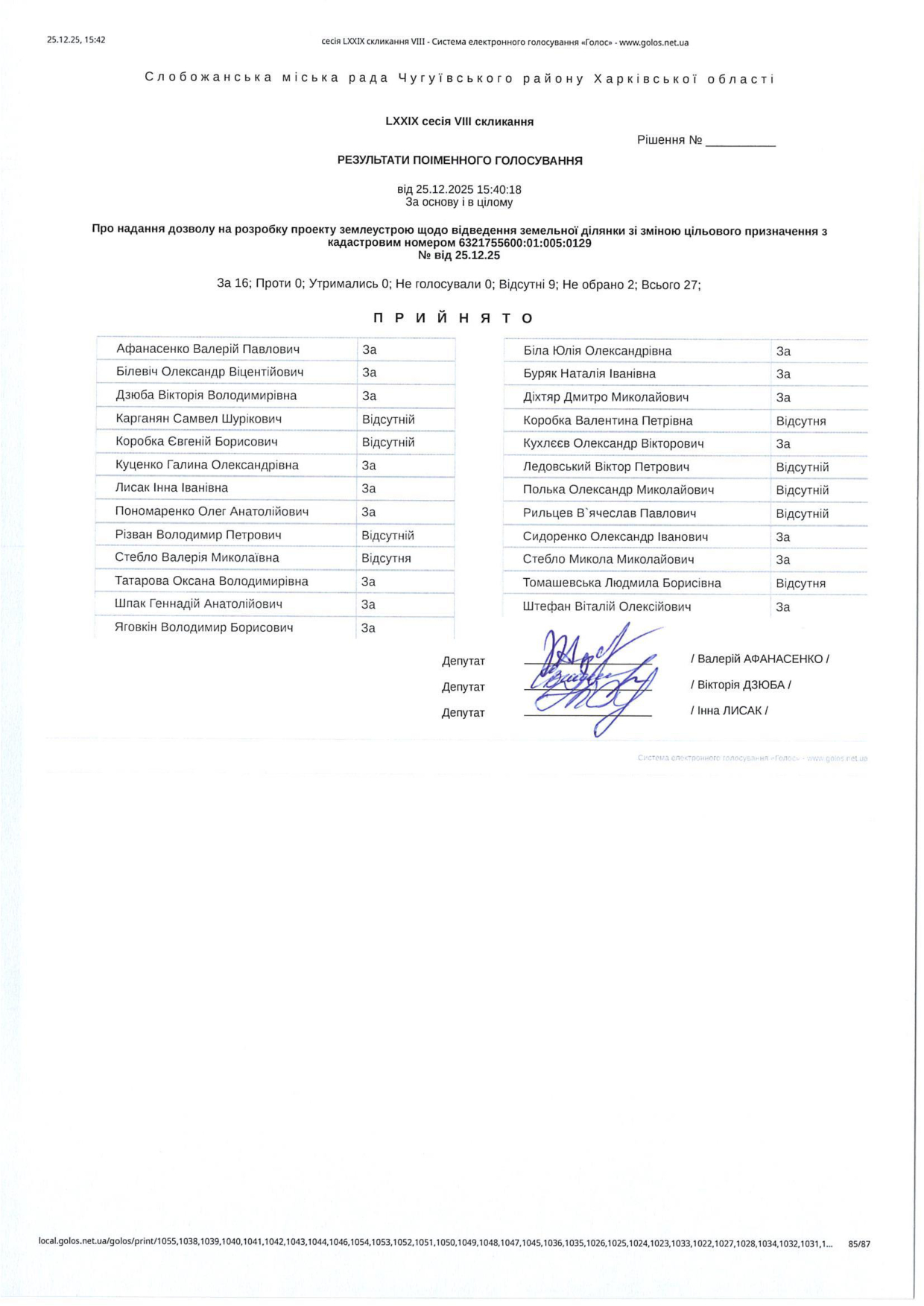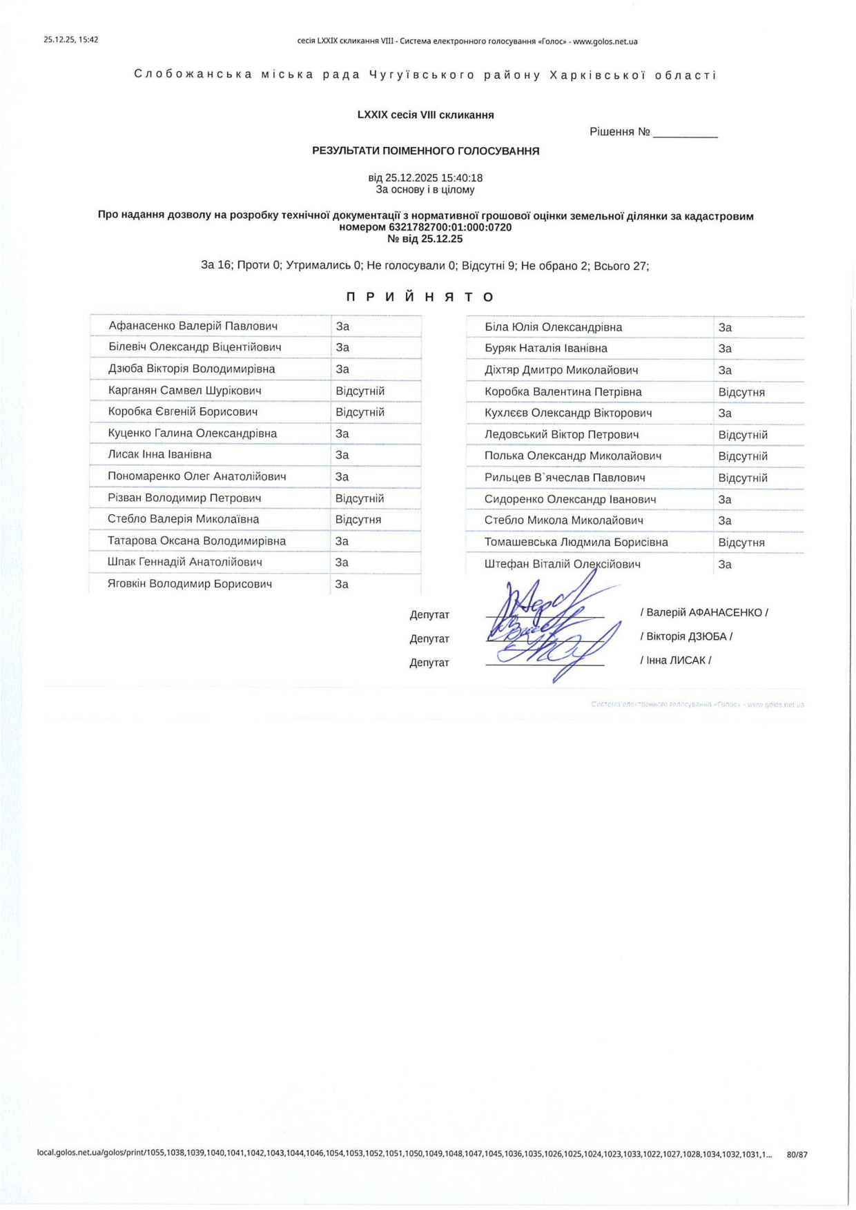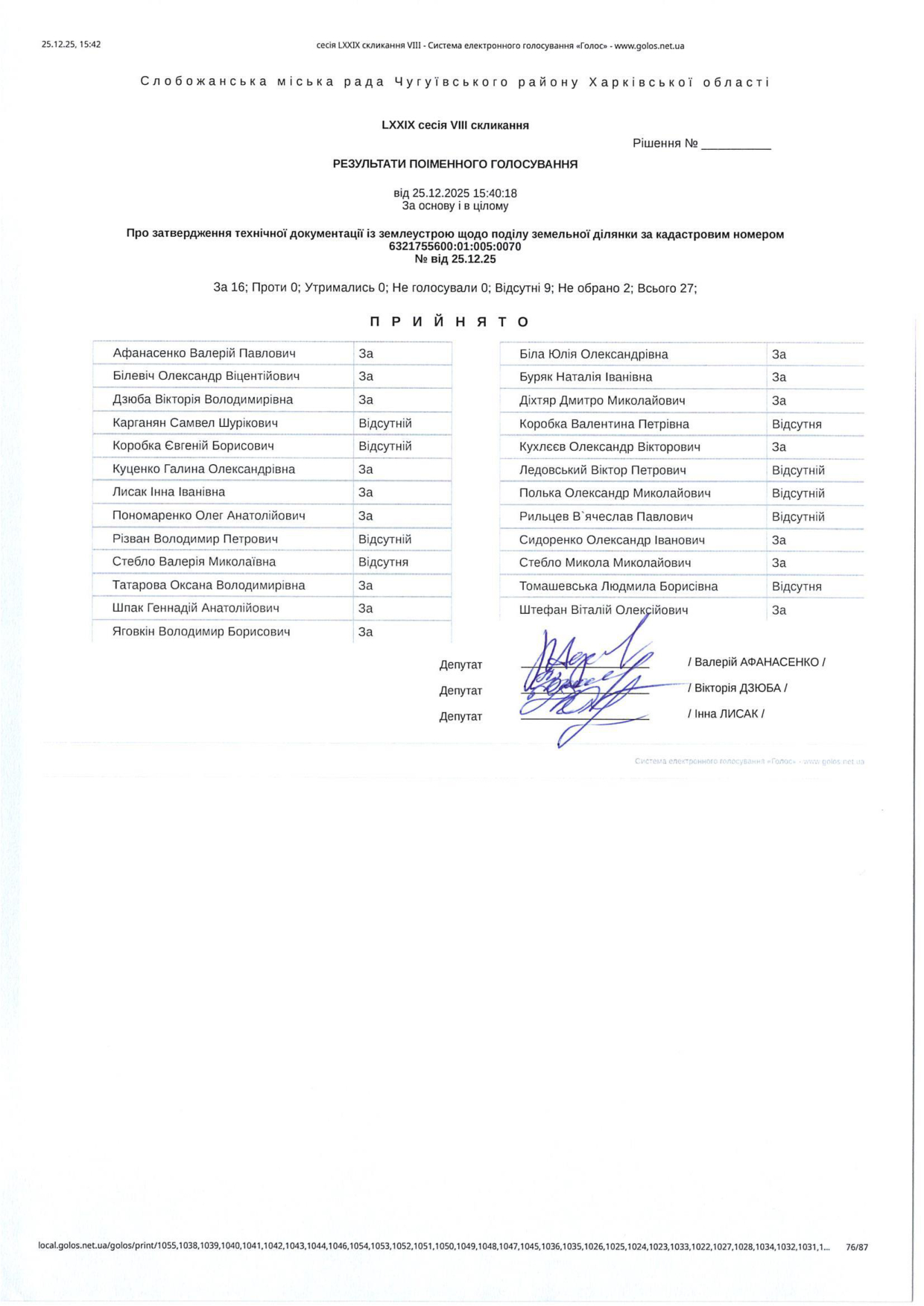 Відомості голосування до рішення сесії №3358 Про затвердження Заходів на 2026 рік до Програми земельних відносин, раціонального використання та охорони земель Слобожанської міської територіальної громади Чугуївського району Харківської області на 2026-2030 роки