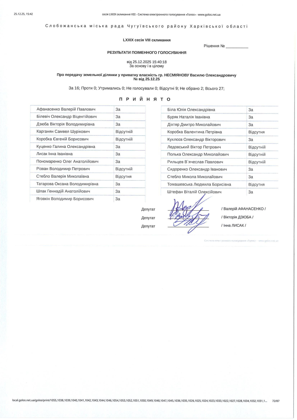 Відомості голосування до рішення сесії №3409 Про передачу земельної ділянки у приватну власність гр. НЕСМІЯНОВУ Василю Олександровичу